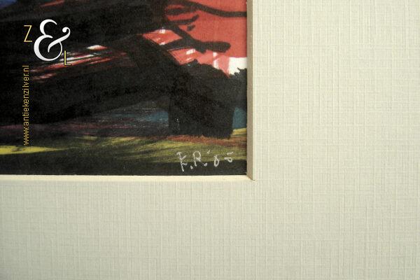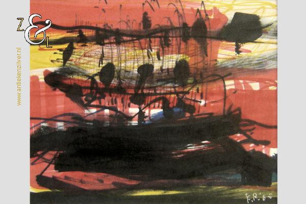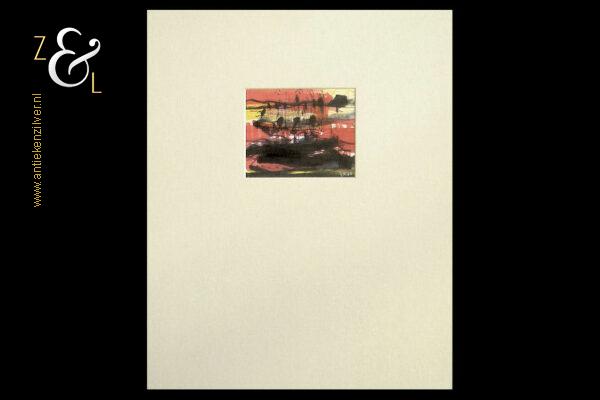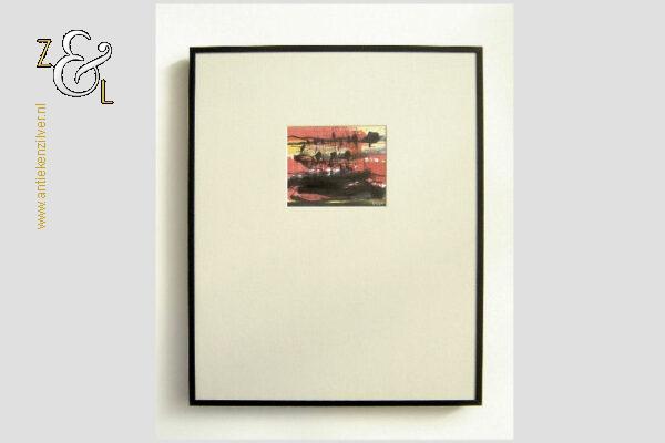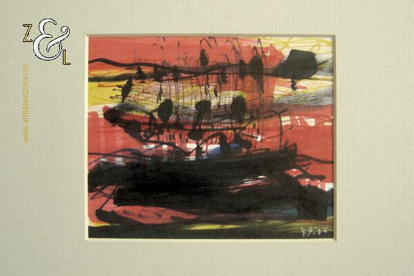 Deze inkttekening / kleurenschets is gemaakt door de Rotterdamse kunstenaar Piet Roovers. Het kunstwerk dat in de abstracte stijl is vervaardigd heeft rechtsonder in witte inkt de initialen van Piet Roovers met daarachter het jaartal wanneer het geproduceerd is: PR ’85. De inkttekening / kleurenschets is aan de binnenzijde van het lichtgrijze passe partout gemeten 13.5 cm lang bij 11.1 cm breed. De zwarte aluminium lijst is aan de buitenkant gemeten 51.2 cm lang bij 41,2 cm breed.