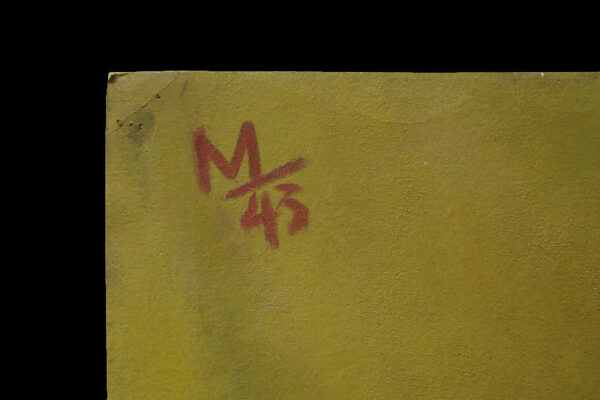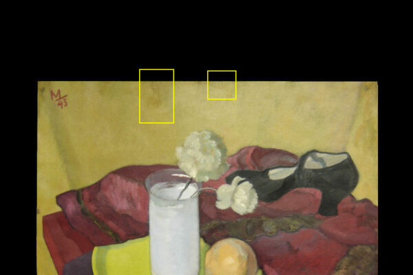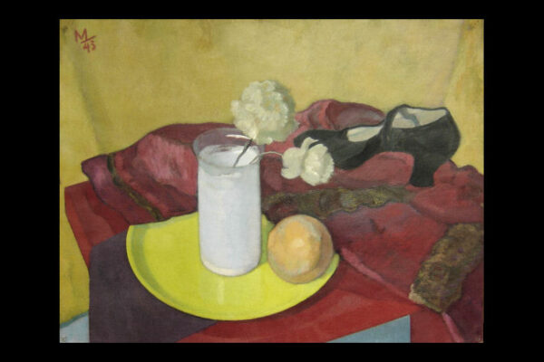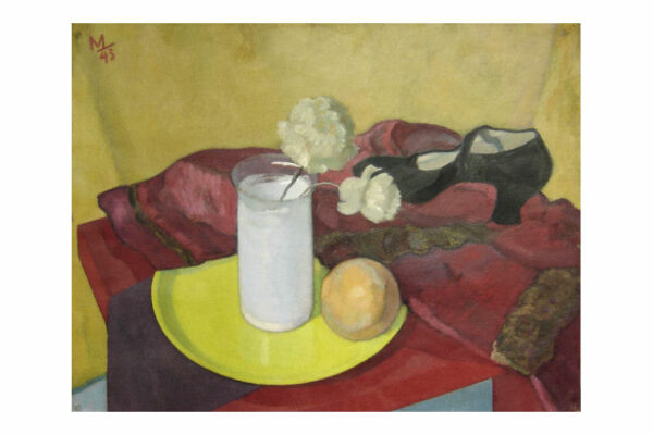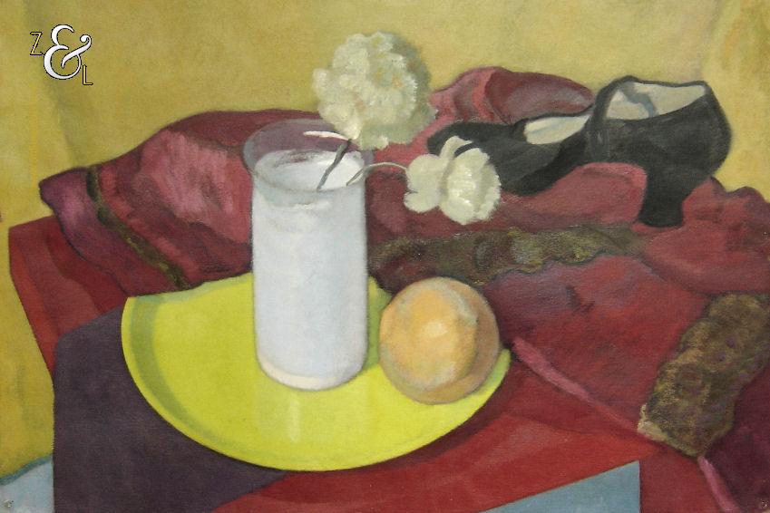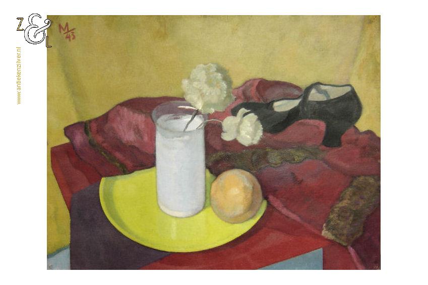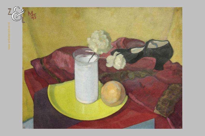 Dit schilderij is gemaakt door Herman Carel (Mans) Meijer. Het schilderij (stilleven) dat in de figuratieve stijl is geschilderd heeft de voorstelling van een rode tafel waarop een rode jas afgezet met bont ligt, waarop een zwarte damesschoen staat en een geel bord waarop een witte glazen vaas met anjers staat en waarop een sinaasappel ligt. Het schilderij is in verf linksboven gesigneerd en gedateerd met M 43 en is 64.8 cm lang bij 49.8 cm breed. Het schilderij dat met olieverf op zwaar papier (schilderskarton) is geschilderd heeft punaisegaatjes en heeft rechtsboven in reliëf het papiermerk AF met daarboven een kroon. Het schilderij heeft wat lichte kreukjes en aan de bovenzijde van het schilderij zitten twee scheurtjes (zie geel omkaderde gedeeltes op afbeeldingen) die aan de achterzijde met speciaal tape geplakt zijn.