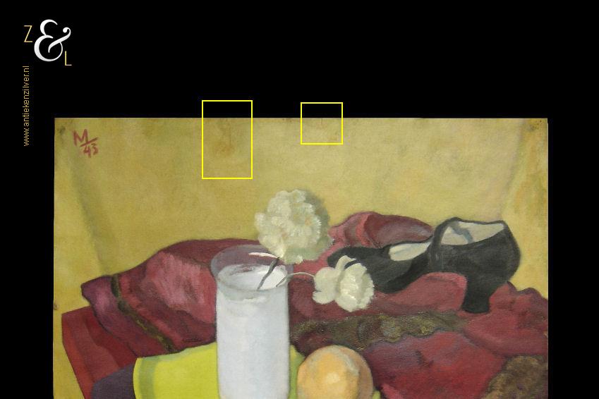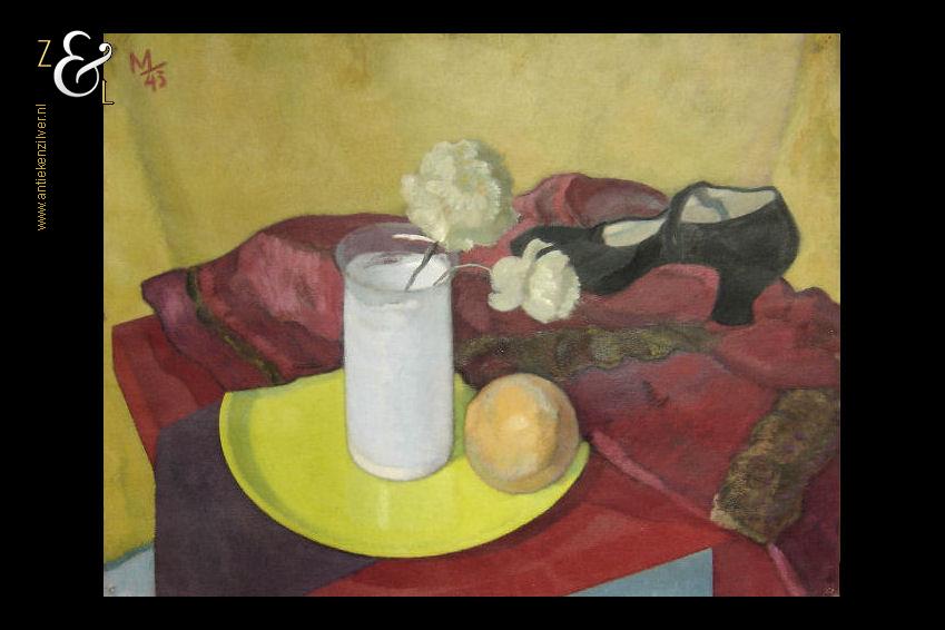 Dit schilderij is gemaakt door Herman Carel (Mans) Meijer. Het schilderij (stilleven) dat in de figuratieve stijl is geschilderd heeft de voorstelling van een rode tafel waarop een rode jas afgezet met bont ligt, waarop een zwarte damesschoen staat en een geel bord waarop een witte glazen vaas met anjers staat en waarop een sinaasappel ligt. Het schilderij is in verf linksboven gesigneerd en gedateerd met M 43 en is 64.8 cm lang bij 49.8 cm breed. Het schilderij dat met olieverf op zwaar papier (schilderskarton) is geschilderd heeft punaisegaatjes en heeft rechtsboven in reliëf het papiermerk AF met daarboven een kroon. Het schilderij heeft wat lichte kreukjes en aan de bovenzijde van het schilderij zitten twee scheurtjes (zie geel omkaderde gedeeltes op afbeeldingen) die aan de achterzijde met speciaal tape geplakt zijn.