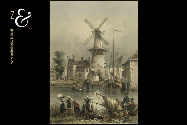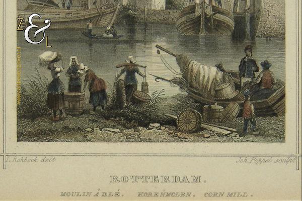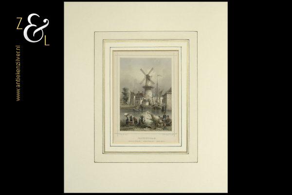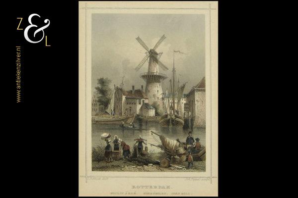 De staalgravure geeft de voorstelling van de laatst overgebleven windmolen in het stadscentrum van Rotterdam. Alle andere windmolens waren al afgebroken voor de uitbreiding van de stad. Deze windmolen was gelegen aan de noordzijde van de Coolsingel, dit is nu een drukke bloeiende straat waaraan gelegen het stadhuis, beursgebouw en alle belangrijke grote warenhuizen. Het kanaal werd gedempt in 1899 terwijl de stad verder naar het westen uitgebreid werd.