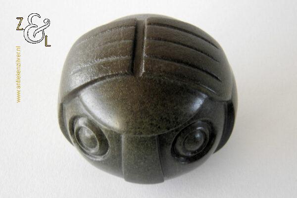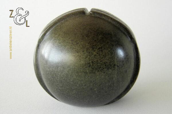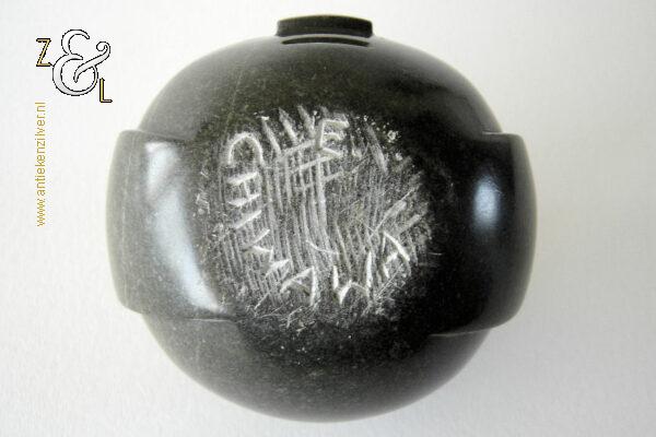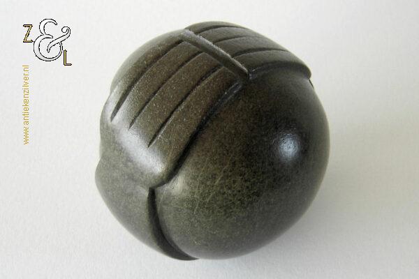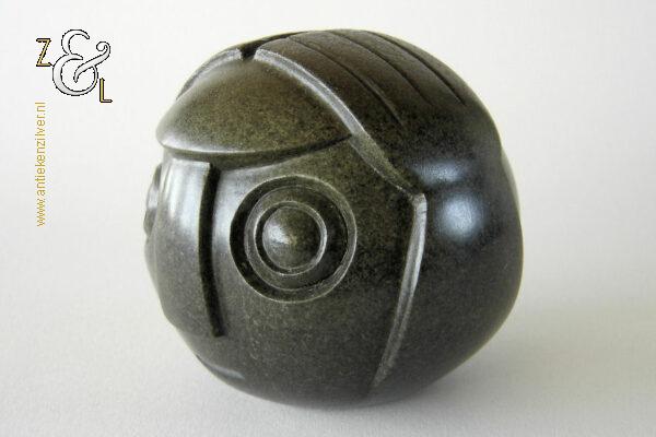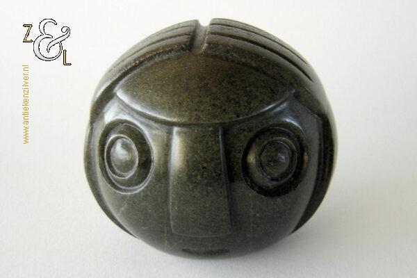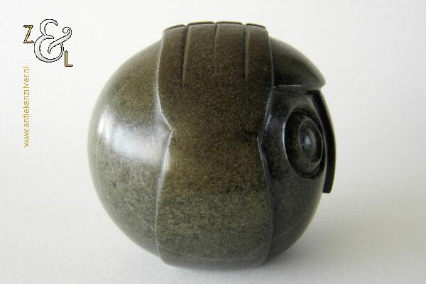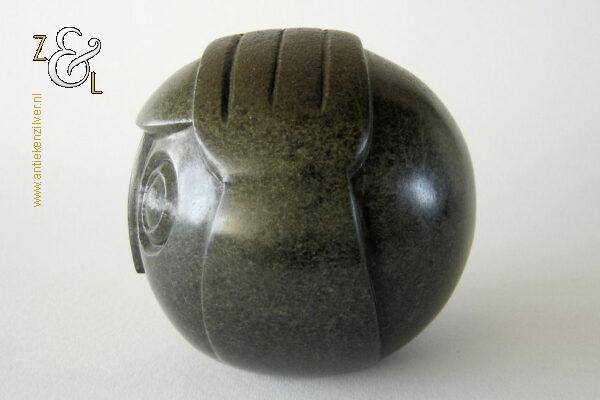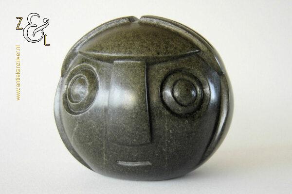 Dit sculptuur model “Ball Head” is gebeeldhouwd in Zimbabwe* Afrika door Edward Chiwawa in serpentijnsteen. Het gestileerde in de Shona* stijl gebeeldhouwde sculptuur heeft ronde ogen die kenmerkend zijn voor de beelden van Edward Chiwawa. Het uit het eind van de 20e eeuw stammende sculptuur is op de hand gebeeldhouwd en gepolijst uit donkergroen serpentijnsteen. Het sculptuur is aan de onderzijde gesigneerd E. Chiwawa weegt 1038 gram heeft een diameter van 9.4 cm en is 8.5 cm hoog.