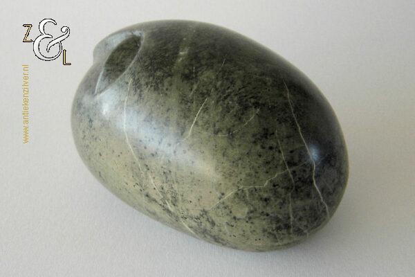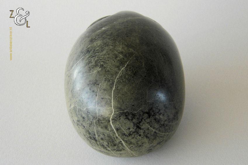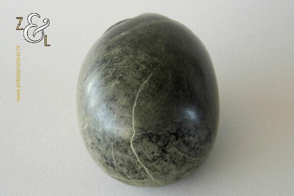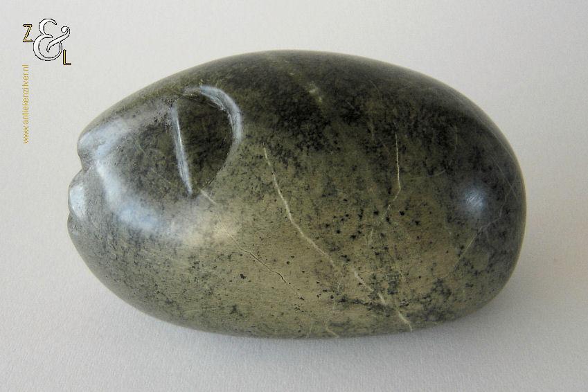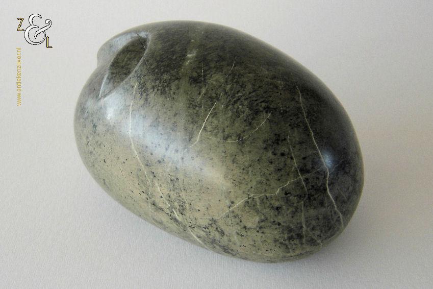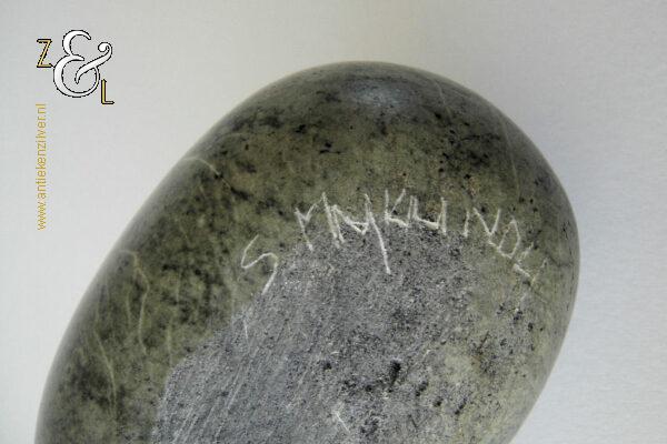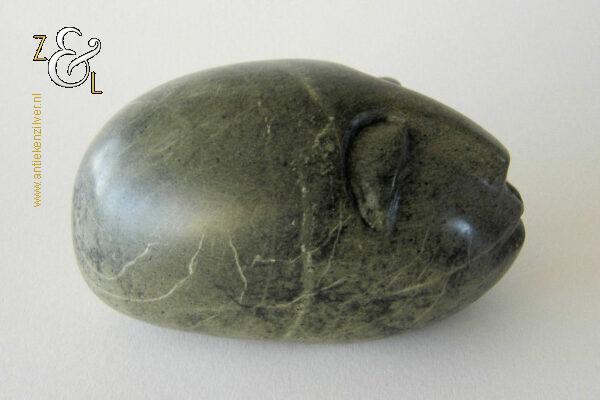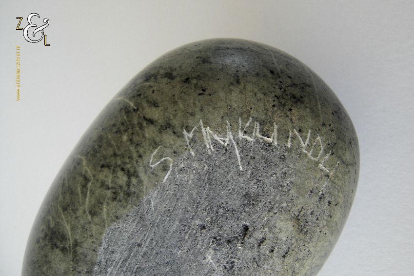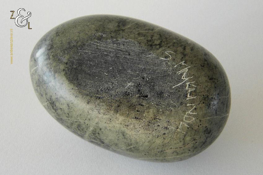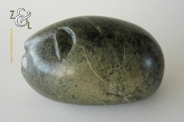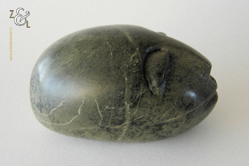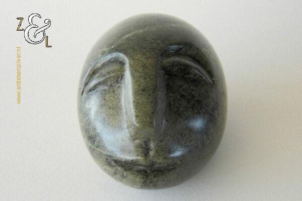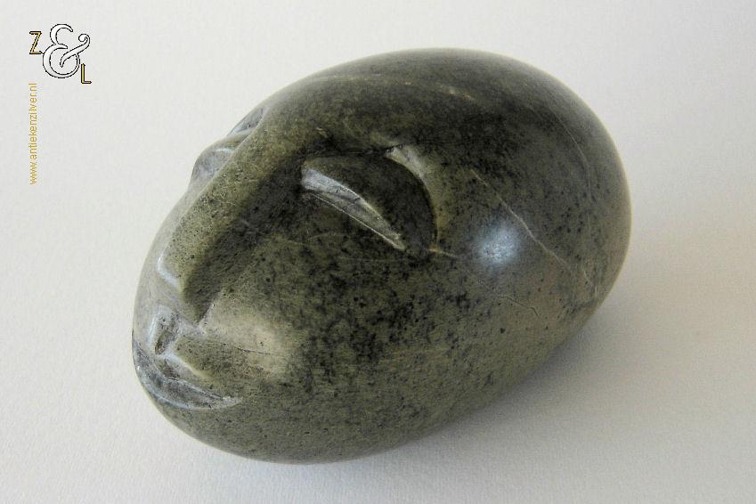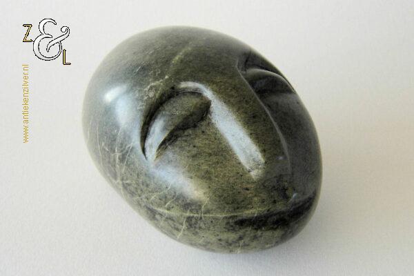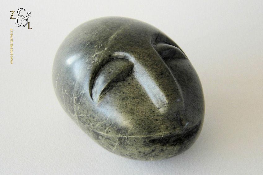 Dit sculptuur model “Slaper” is gebeeldhouwd in Zimbabwe* Afrika door Suku Mukundu. Het gestileerde in de Shona* stijl gebeeldhouwde sculptuur heeft de afbeelding van een slapend gezicht met een langwerpig hoog voorhoofd, zware oogleden en een serene glimlach. Het uit het eind van de 20e eeuw stammende sculptuur is op de hand gebeeldhouwd en gepolijst uit donkergroen geaderd serpentijnsteen. Het sculptuur is aan de onderzijde gesigneerd S. Mukundu weegt 1098 gram en is 12.5 cm lang bij 7.9 cm breed bij 7 cm hoog.