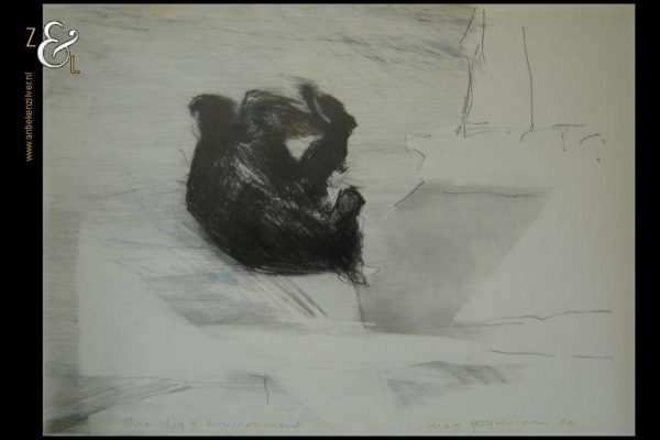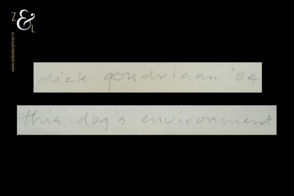 Deze tekening met de titel “This dog’s environment” is gemaakt door Dick Goudriaan. De tekening is rechtsonder in potlood gesigneerd en gedateerd Dick Goudriaan ’84 en linksonder staat de titel This dog’s environment. De tekening is gemaakt op Schoeller Durex papier en is 62.6 cm lang bij 45 cm breed. De tekening is licht verkleurd.