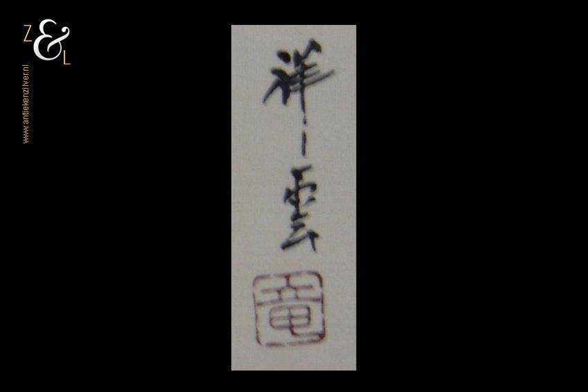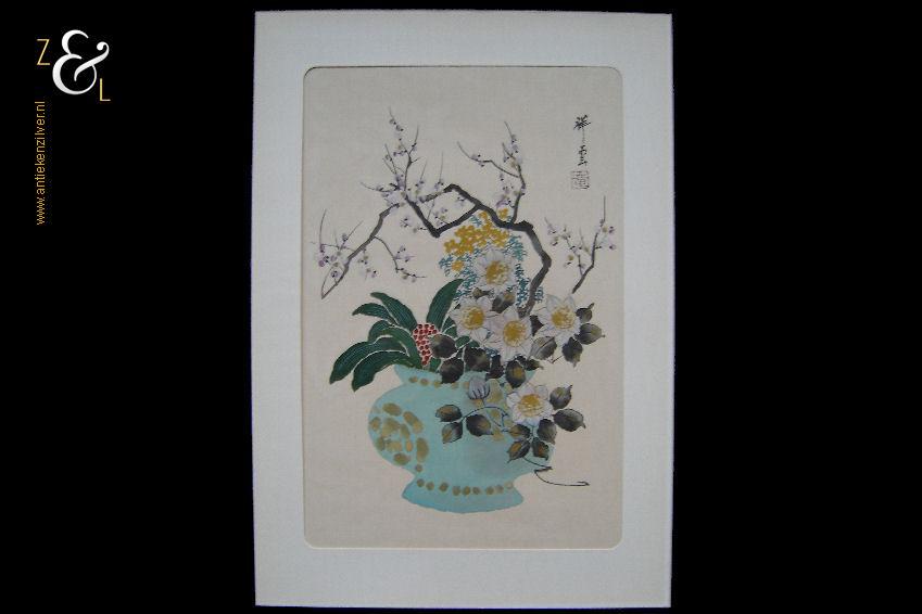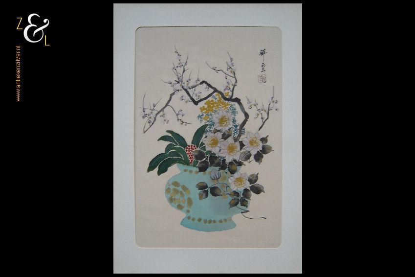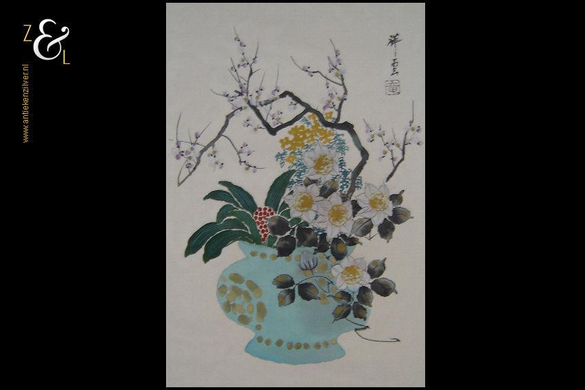 Deze aquarel die op zijde geschilderd is heeft de afbeelding van bloemen en een bloesemtak in een pot en is gemaakt in China. De aquarel is rechtsboven voorzien van karakters en een zegel en meet 38.2 cm bij 25.2 cm (binnenkant passe partout). De buitenzijde van het passe partout meet 47.7 cm bij 33.3 cm.