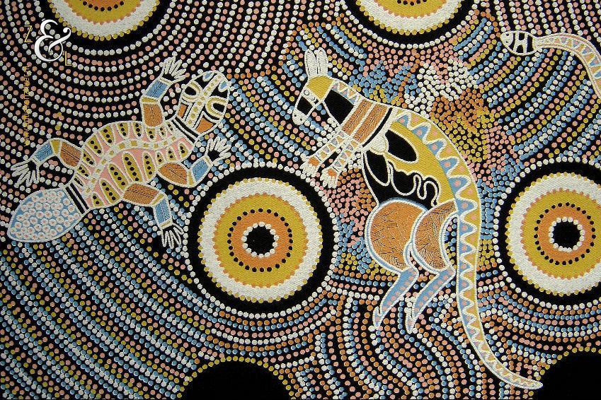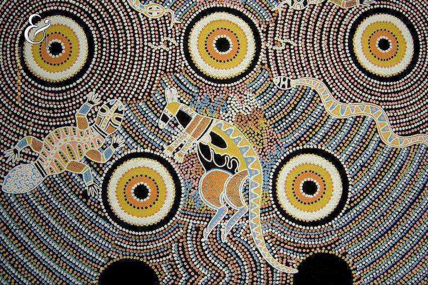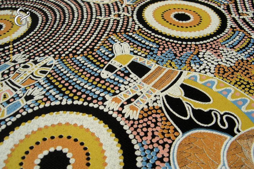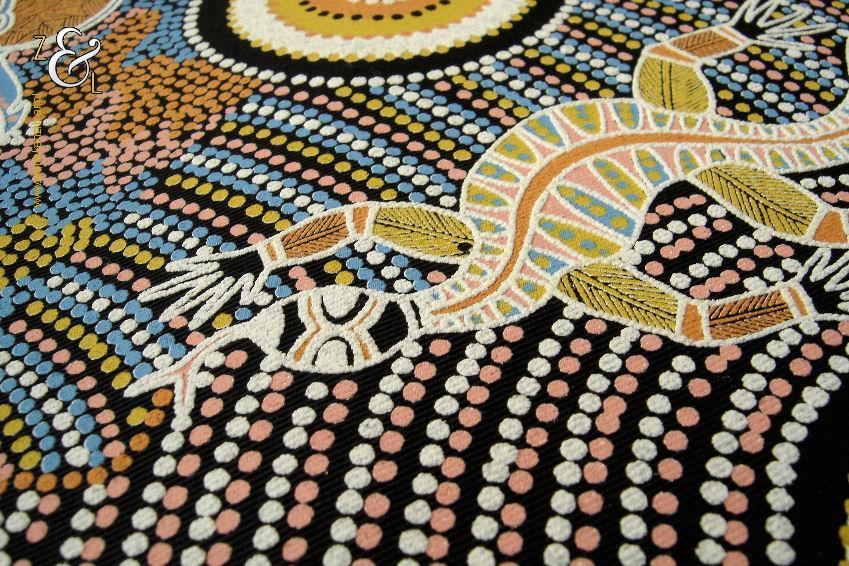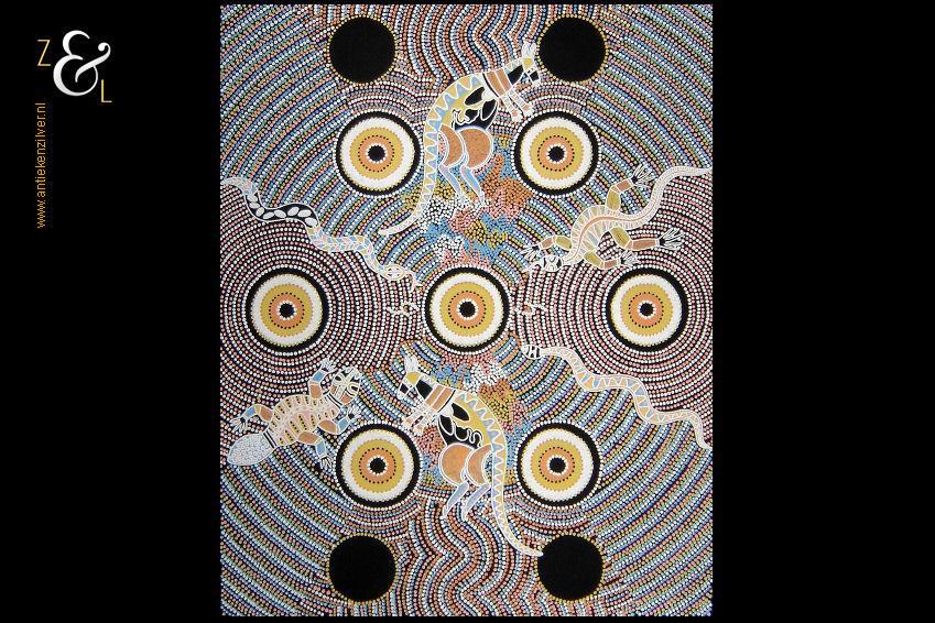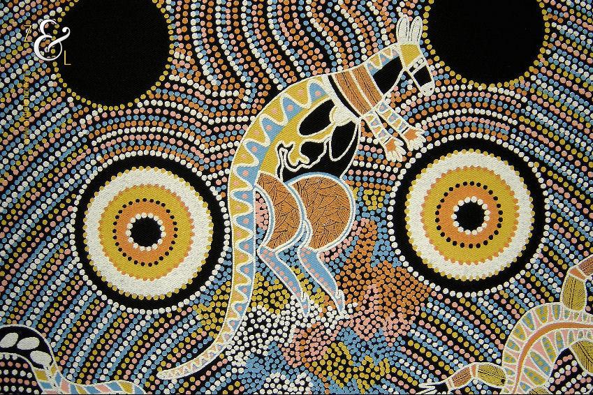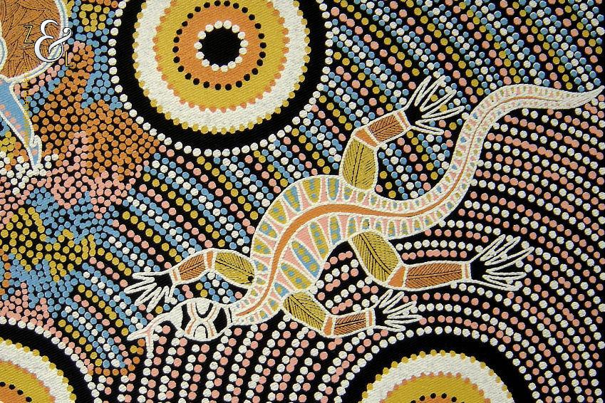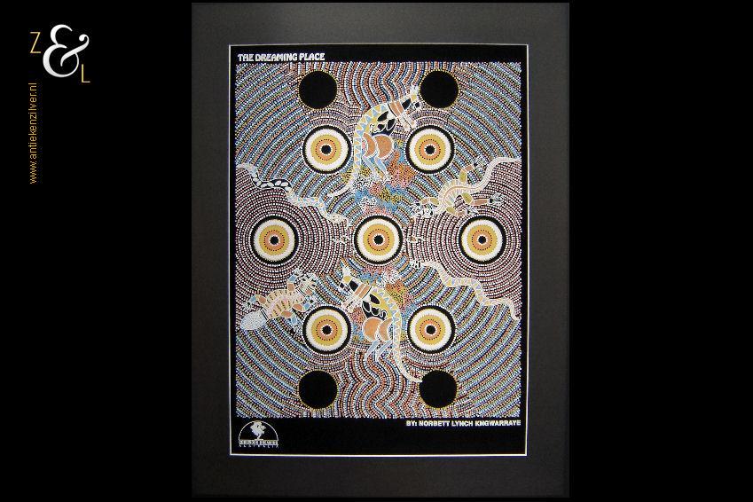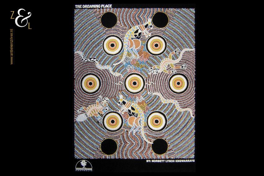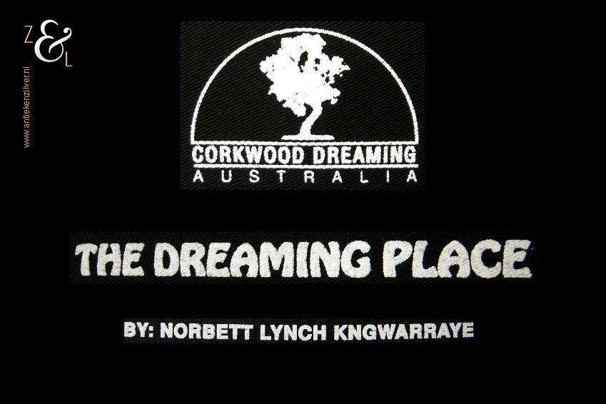Deze zeefdruk met de titel The Dreaming Place komt uit de serie Corkwood Dreaming Australia en is gemaakt door Norbett Lynch Kngwarreye. De zeefdruk waarvan de afbeelding (elke kleur apart) handmatig met verf gedrukt is op een zwarte katoenen ondergrond is eind tachtiger begin negentiger jaren verkocht in Alice Springs Australië. De in de Aboriginal stijl gemaakte zeefdruk heeft de afbeeldingen van kangoeroes slangen en hagedissen. De zeefdruk is gemeten aan de binnenzijde van het passe partout 57.5 cm lang bij 41.5 cm breed. De buitenzijde van het passe partout is 71 cm lang bij 54 cm breed breed. Het zwarte passe partout is verkleurd.
