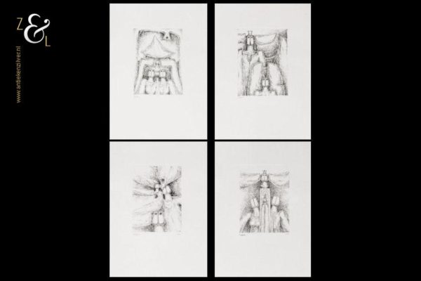 Deze kunstmap waarin vier etsen van Hubert Minnebo is in 1987 uitgegeven ter gelegenheid van de inhuldiging van het nieuwe V.K.W. (Verbond van Katholieke Werkgevers) gebouw te Antwerpen. Tevens bevat de kunstmap twee afbeeldingen van twee bronzen beelden van Hubert Minnebo met de titels: “Na dagenlange Yogische afzondering” en “Het reflecteren van al mijn verlangens, zo duidelijk zichtbaar” en twee brieven waarin Hubert Minnebo uitleg geeft over het bronzen beeld dat hij voor het V.K.W. maakte en dat afgebeeld is op de buitenzijde van de kunstmap. De etsen zijn linksonder gesigneerd en rechtsonder staat e.a. (épreuve d’artiste*). Tevens heeft Hubert Minnebo de etsplaten gesigneerd met “minnebo”. De etsen zijn aan de buitenzijde gemeten 41 cm lang bij 30 cm breed de etsen zelf zijn 20 cm lang bij 15 cm breed.