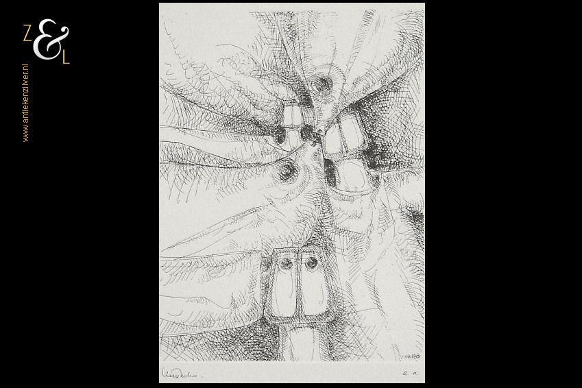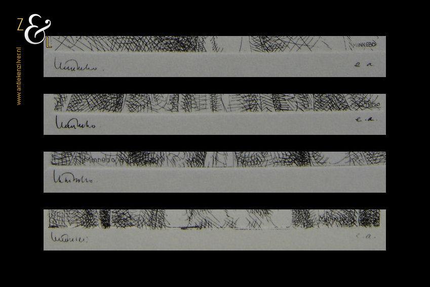 Deze kunstmap waarin vier etsen van Hubert Minnebo is in 1987 uitgegeven ter gelegenheid van de inhuldiging van het nieuwe V.K.W. (Verbond van Katholieke Werkgevers) gebouw te Antwerpen. Tevens bevat de kunstmap twee afbeeldingen van twee bronzen beelden van Hubert Minnebo met de titels: “Na dagenlange Yogische afzondering” en “Het reflecteren van al mijn verlangens, zo duidelijk zichtbaar” en twee brieven waarin Hubert Minnebo uitleg geeft over het bronzen beeld dat hij voor het V.K.W. maakte en dat afgebeeld is op de buitenzijde van de kunstmap. De etsen zijn linksonder gesigneerd en rechtsonder staat e.a. (épreuve d’artiste*). Tevens heeft Hubert Minnebo de etsplaten gesigneerd met “minnebo”. De etsen zijn aan de buitenzijde gemeten 41 cm lang bij 30 cm breed de etsen zelf zijn 20 cm lang bij 15 cm breed.
