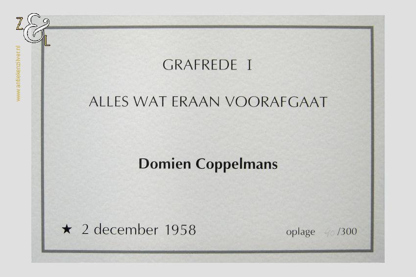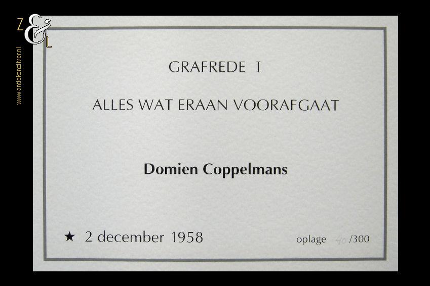 Deze zeefdruk met de titel “Grafrede I” is gemaakt door Domien Coppelmans. De zeefdruk is met zwarte inkt gedrukt op wit 240 grams structuurpapier. Op de zeefdruk staat rechtsonder de oplage 40/300 nummer 40 van 300. De zeefdruk heeft de afmeting van een A4, 29.7 cm lang bij 21 cm breed.