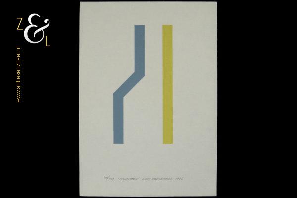 Deze zeefdruk met de titel “Landmark” is gemaakt door Guus Koenraads. De zeefdruk is met de kleuren blauw en geel gedrukt op gebroken wit 240 grams papier. Op de zeefdruk staat aan de onderzijde in potlood de oplage 40/300 nummer 40 van 300 de titel “Landmark” de signatuur van Guus Koenraads en het jaartal 1996. De zeefdruk heeft de afmeting van een A4, 29.7 cm lang bij 21 cm breed.