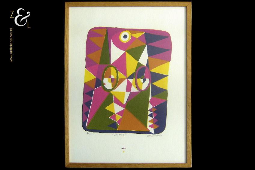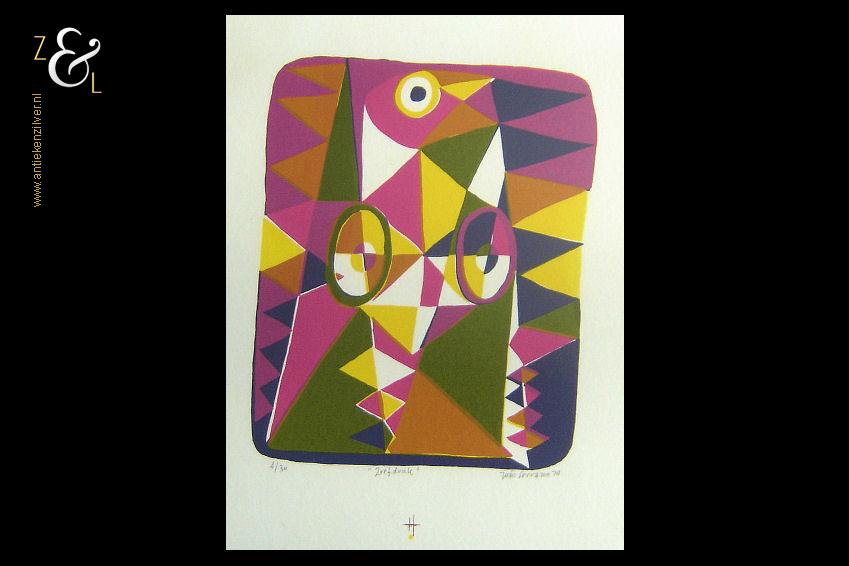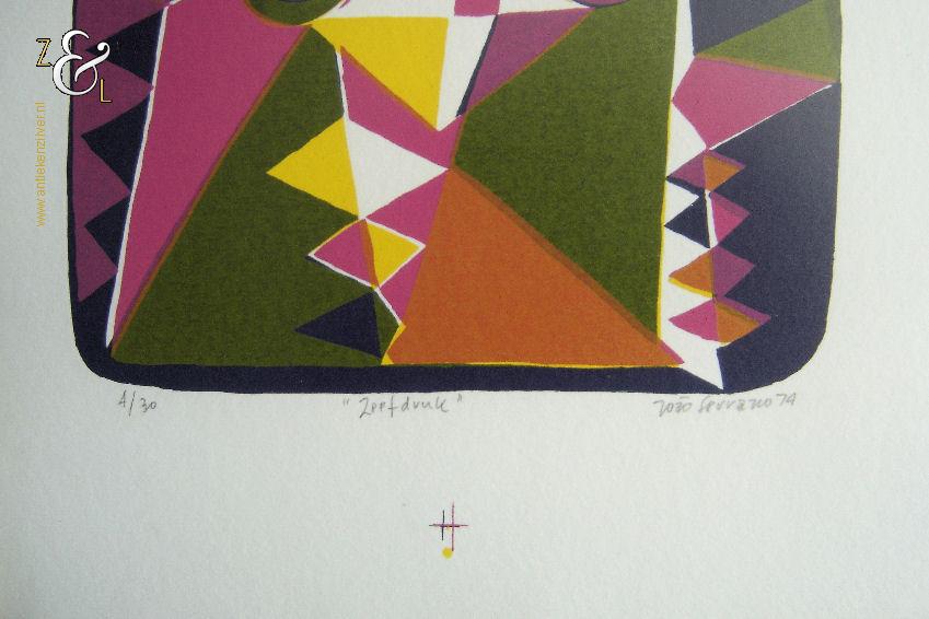 Deze zeefdruk is gemaakt door João Pedro T.M. Serrano (geboren in Lissabon, Portugal). De zeefdruk is ingelijst in een houten lijst en heeft ontspiegeld glas. Op de achterzijde van het kunstwerk zit een etiket met gegevens van de kunstenaar (adres, telefoonnummer enz.). De zeefdruk is rechtsonder in potlood gesigneerd en gedateerd João Serrano 74, linksonder staat de oplage 4/30 nummer vier van dertig en in het midden staat “Zeefdruk”. De zeefdruk is aan de buitenkant van de lijst gemeten 34.4 cm lang bij 26.7 cm breed.