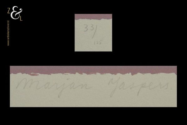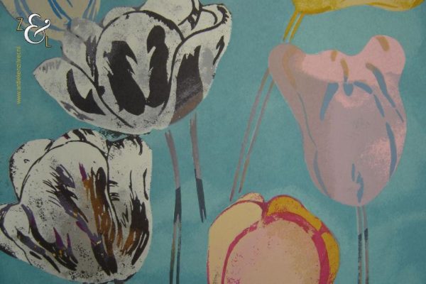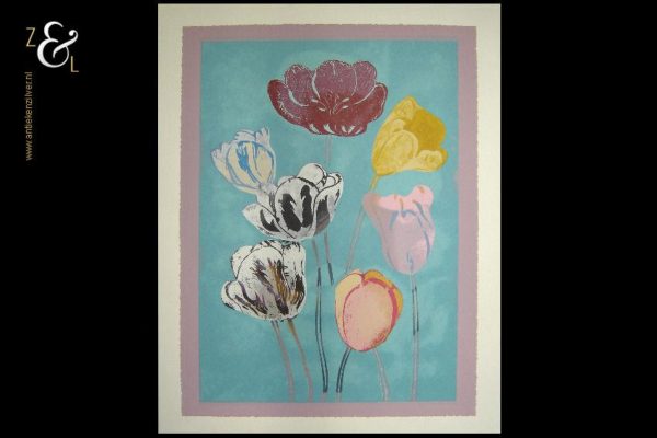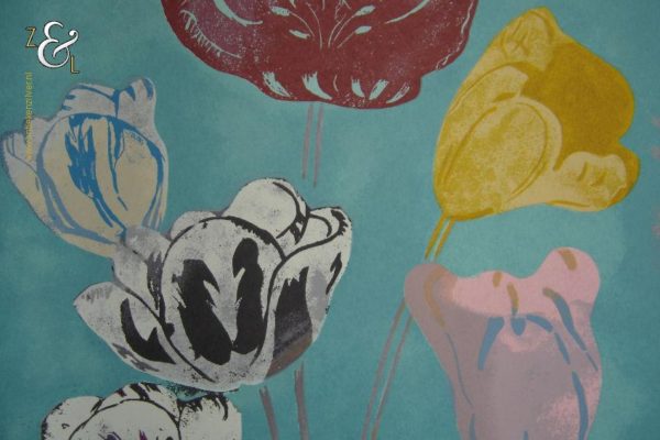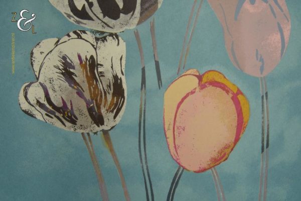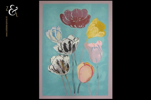 Deze grote zeefdruk gemaakt door Marjan Jaspers met de titel “Tulpen” meet 100 cm bij 80 cm. De zeefdruk is in potlood rechtsonder gesigneerd Marjan Jaspers en linksonder staat de oplage 33 / 125.