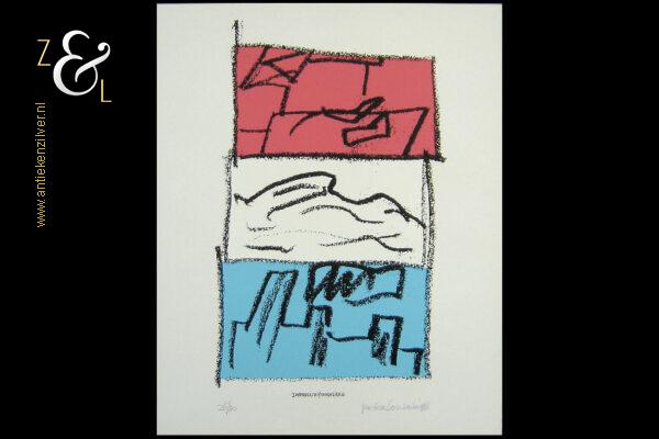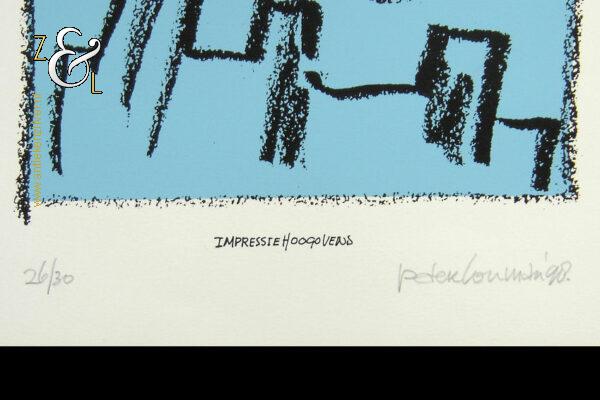 Deze zeefdruk met de titel “Impressie Hoogovens” is gemaakt door Peter Louman. De zeefdruk is rechtsonder in potlood gesigneerd en gedateerd peter louman ’98 en linksonder staat de oplage 26/30. In het midden staat gedrukt de titel: Impressie Hoogovens. De zeefdruk is 50 cm lang bij 40 cm breed.