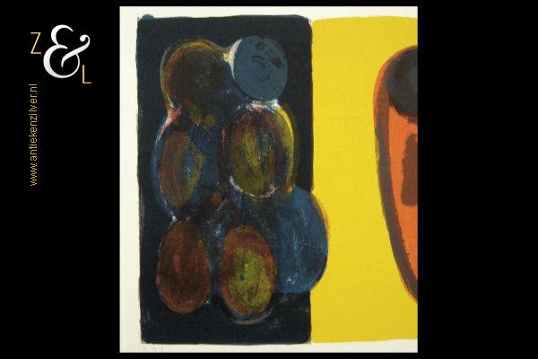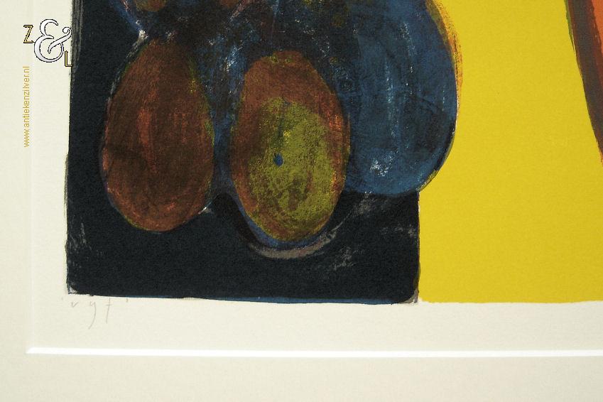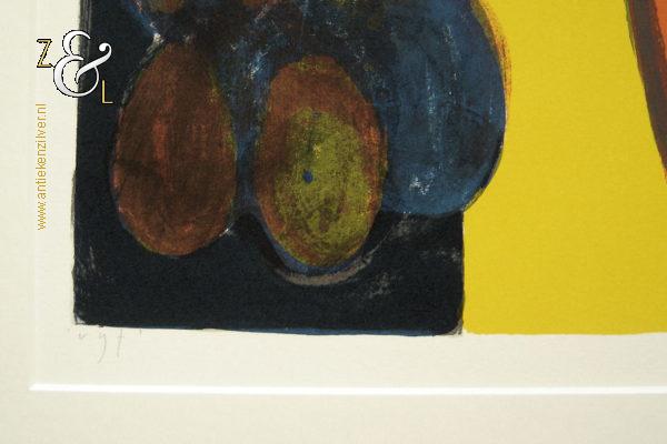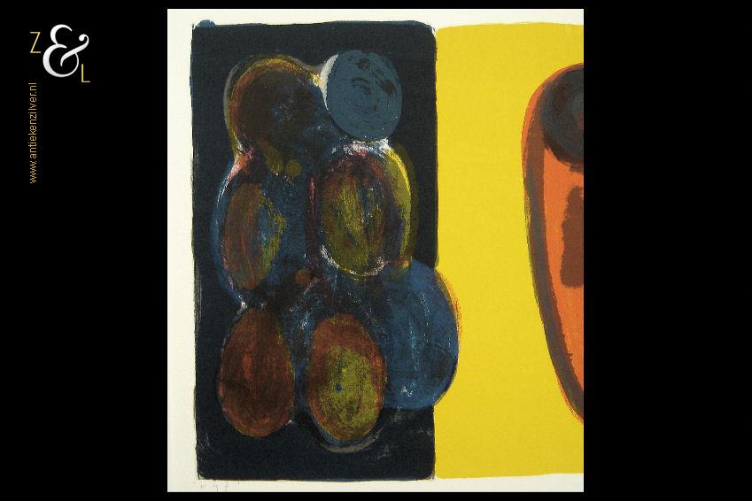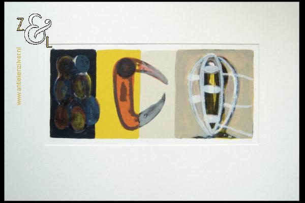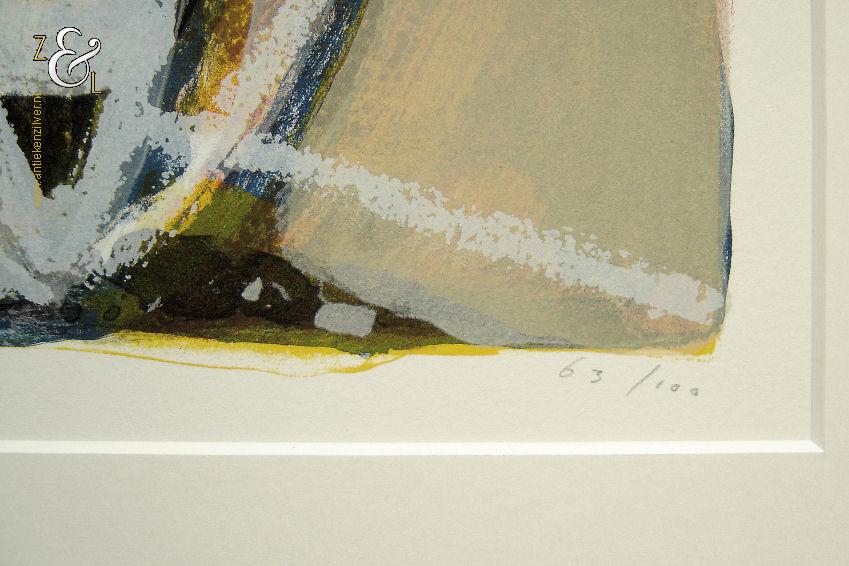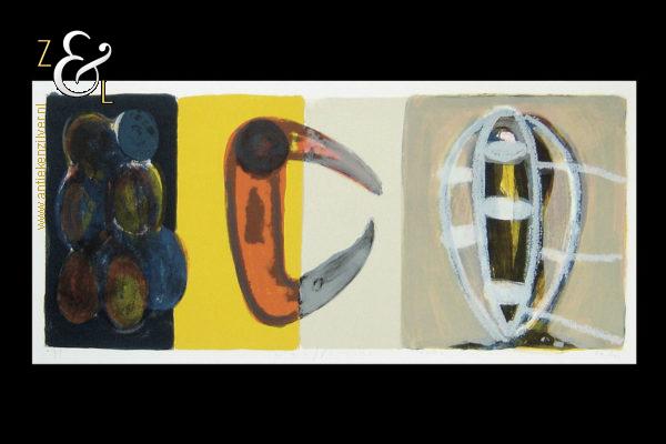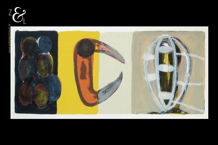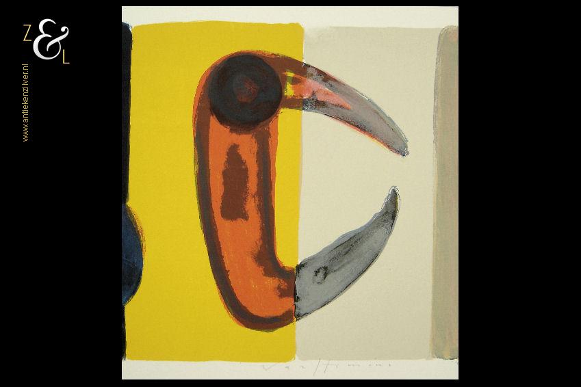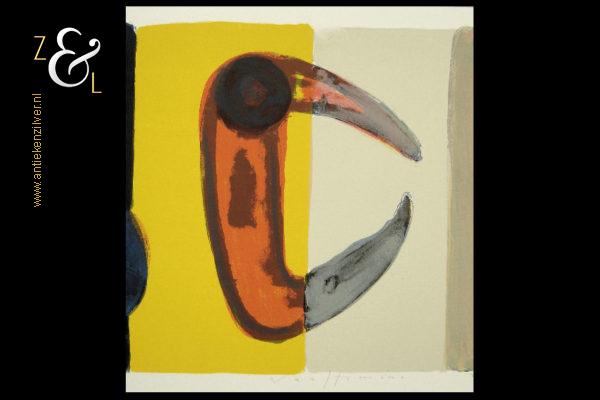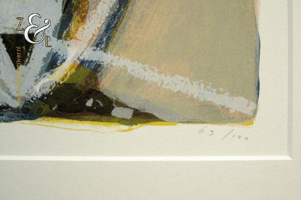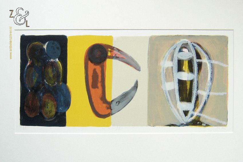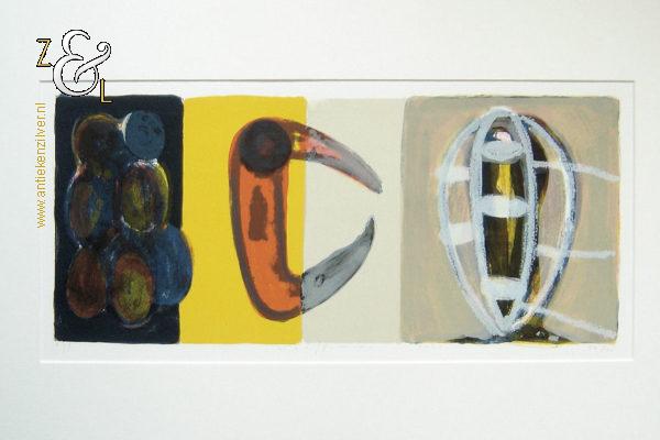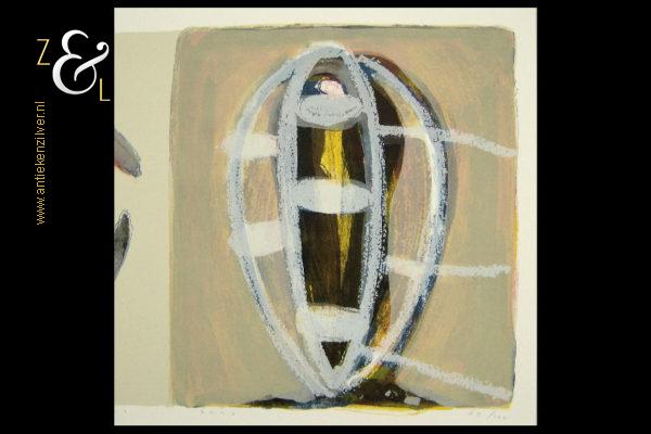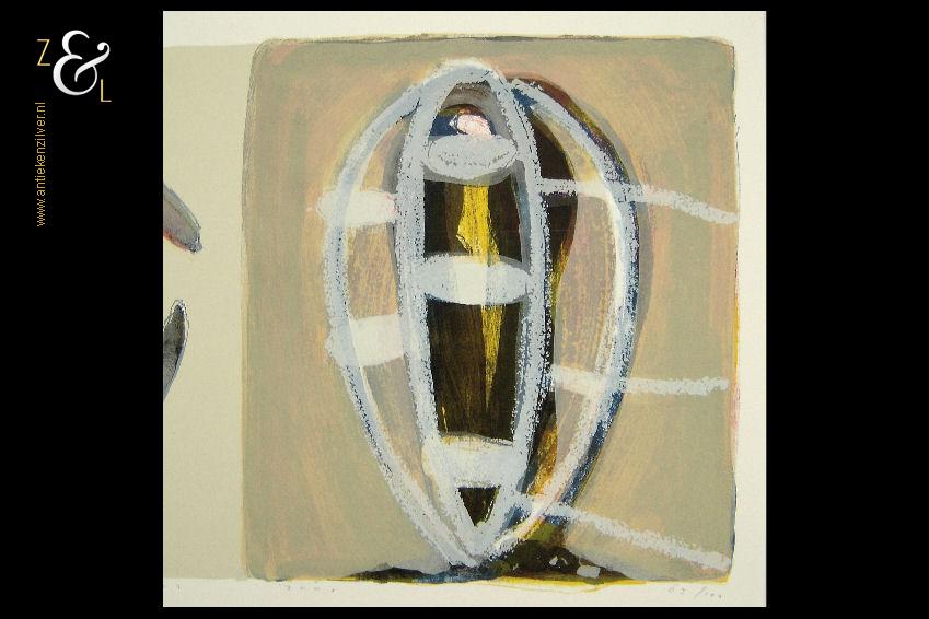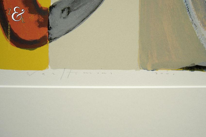 Deze zeefdruk van een abstracte compositie is gemaakt door Piet Warffemius. De zeefdruk is in het midden met potlood gesigneerd en gedateerd Warffemius 2001 en rechtsonder staat de oplage 63/100 nummer 63 van 100. De zeefdruk is aan de buitenzijde van het passe partout gemeten 90 cm lang bij 60 cm breed, de zeefdruk zelf meet aan de binnenzijde van het passe partout gemeten 63.5 cm lang bij 29 cm breed.