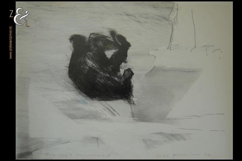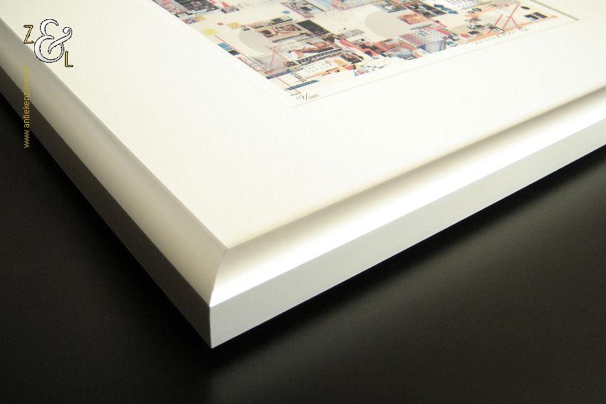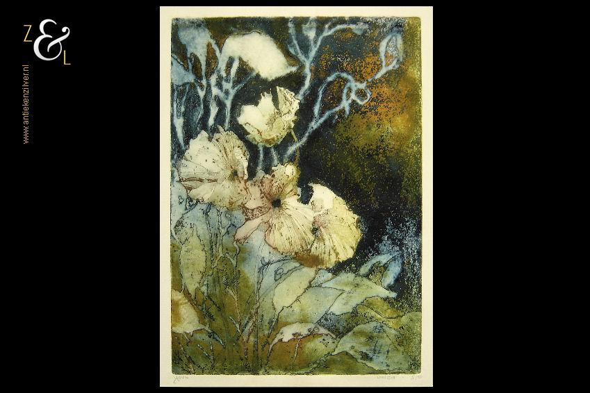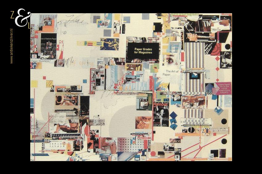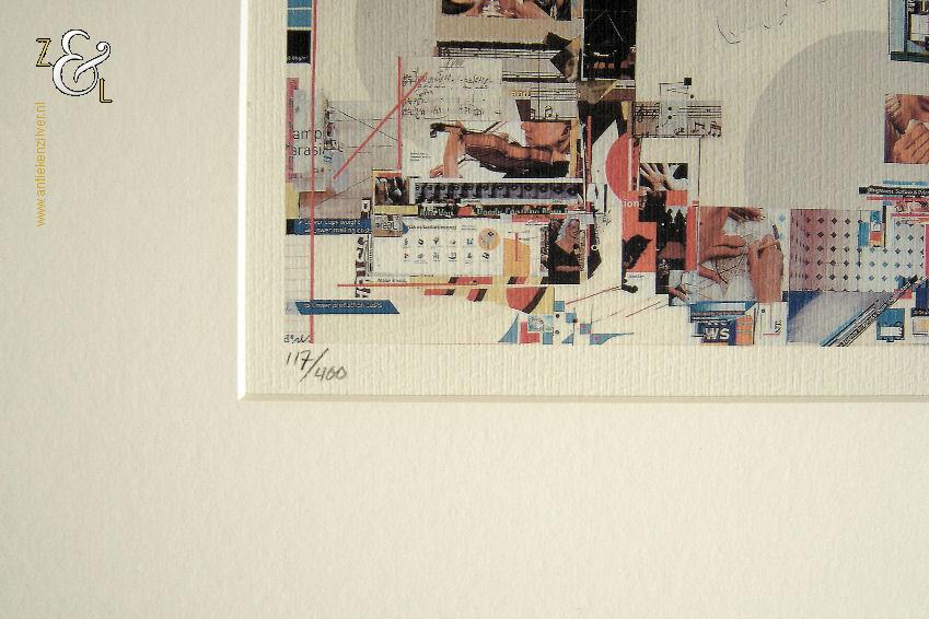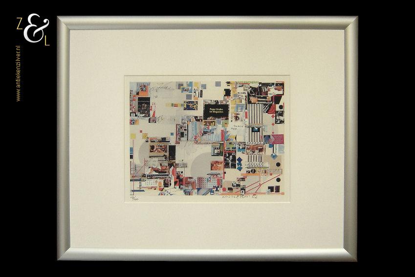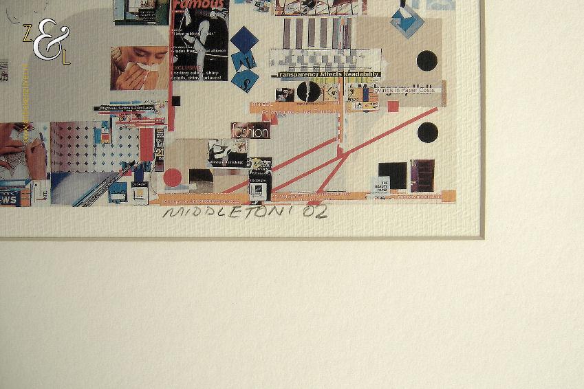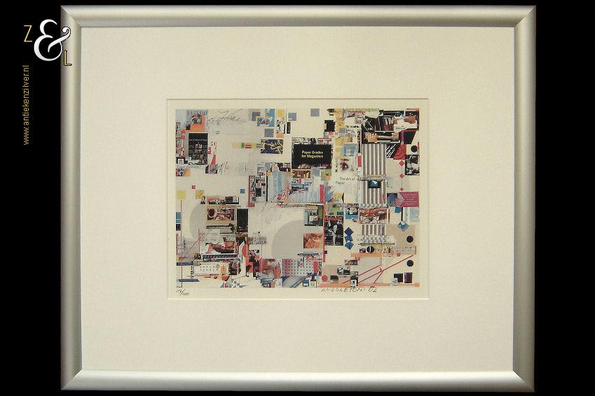 Deze zeefdruk van een collage in abstract expessionistische stijl is gemaakt door Sam Middleton. De zeefdruk is rechtsonder in potlood gesigneerd en gedateerd Middleton ’02 en linksonder staat de oplage 117/400. De zeefdruk is aan de binnenzijde van het passe partout gemeten 28.8 cm lang bij 22.2 cm breed. De aluminium lijst is aan de buitenzijde gemeten 53.4 cm lang bij 43.5 cm breed.