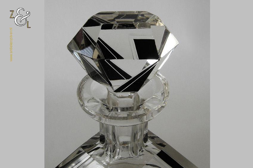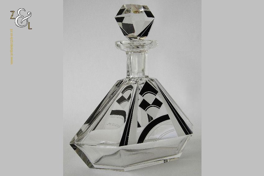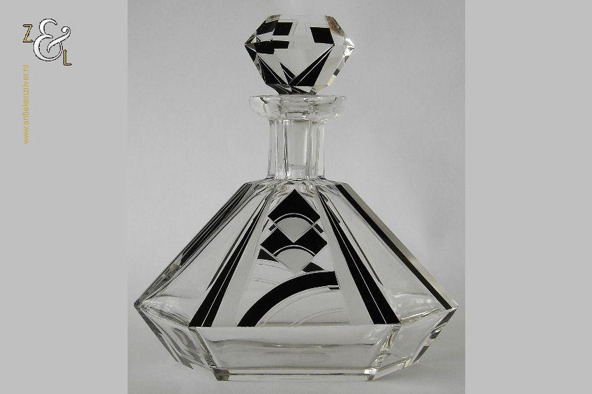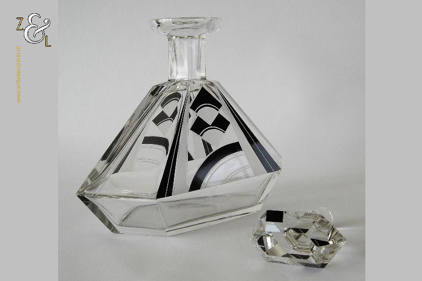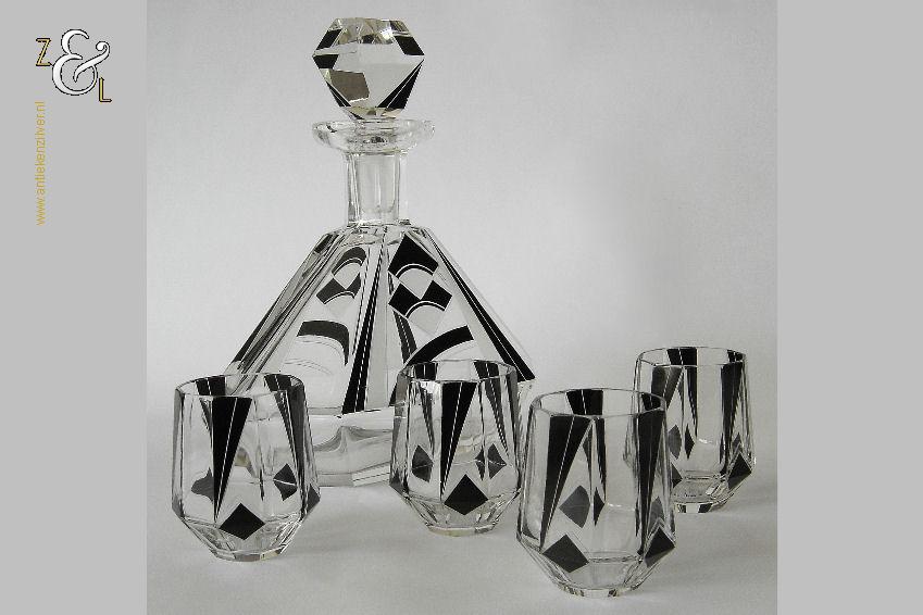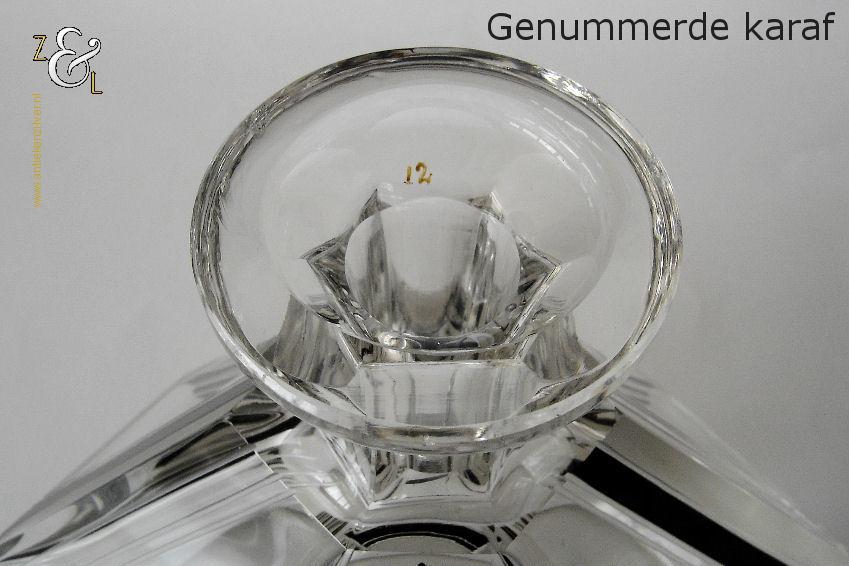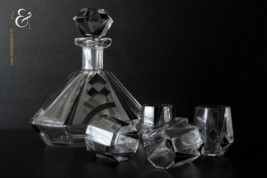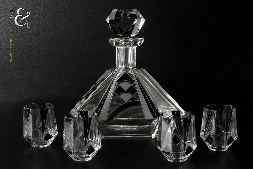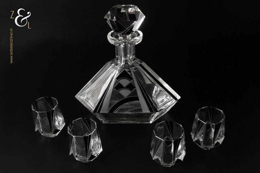 Deze karaf en 4 glazen zijn gemaakt in Tsjechië – Bohemen bij de Firma Karl Palda en stammen uit de Art Deco periode (omstreeks 1930). De in hoogwaardig helder kristal uitgevoerde karaf en glazen zijn op de hand symmetrisch facetgeslepen, gepolijst en geometrisch zwart geëtst. De karaf en stop zijn genummerd (12) en aan de onderzijde heeft de karaf een in de vorm van een lens weggeslepen pontilmerk (zie afbeeldingen met geel omkaderde gedeeltes). De karaf en 4 glazen wegen samen 1390 gram. De tienkantige glazen hebben een diameter van 5.5 cm en zijn 6 cm hoog, de karaf is 19.5 cm lang bij 9.5 cm breed bij 20.7 cm hoog. De karaf en glazen hebben lichte gebruikssporen. De karaf heeft een héél lichte aanslag onderin de karaf (zie afbeelding).