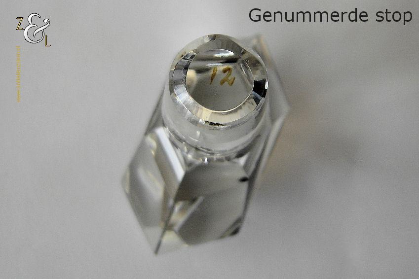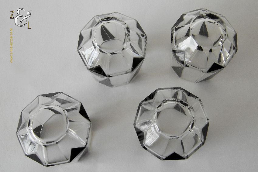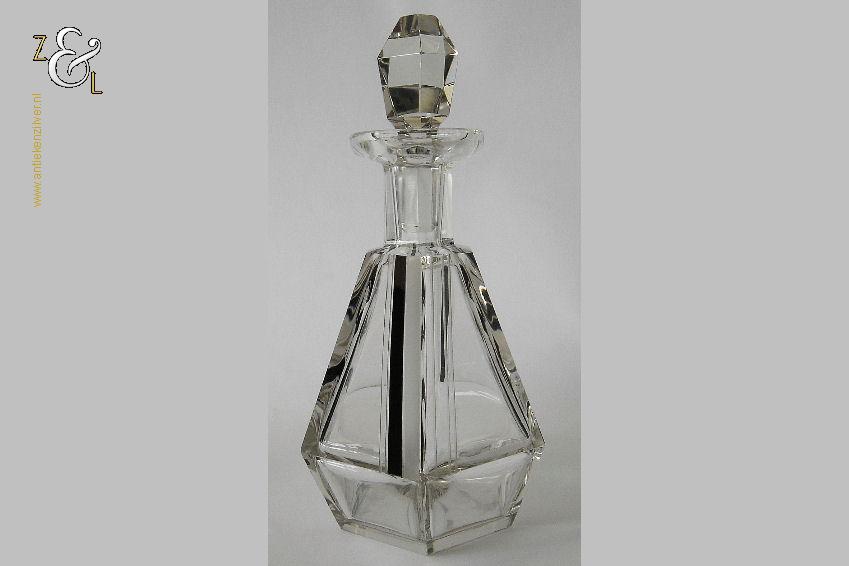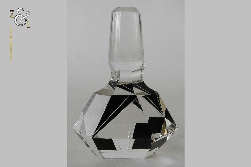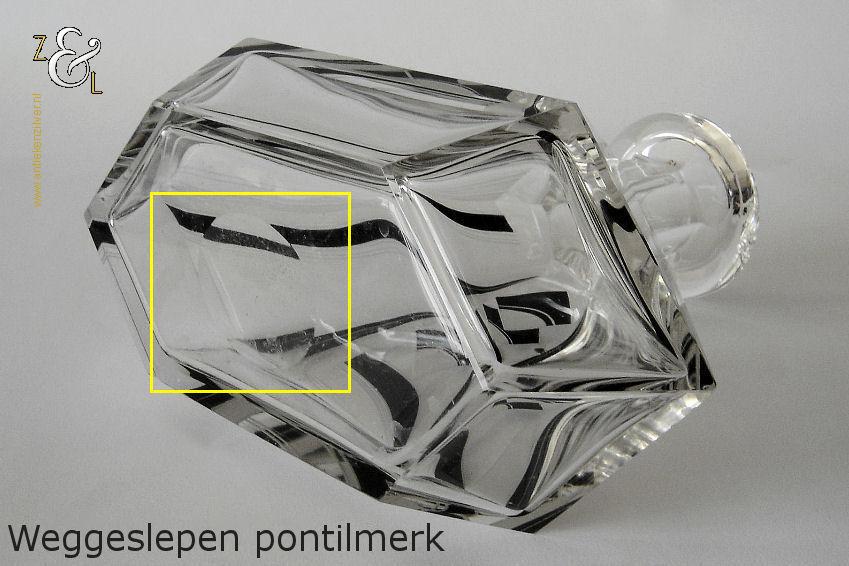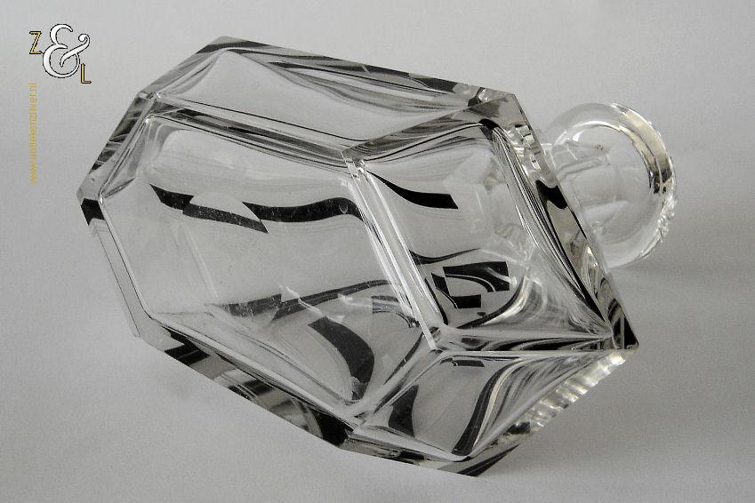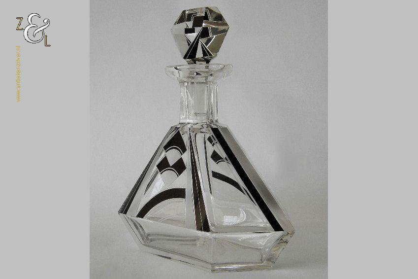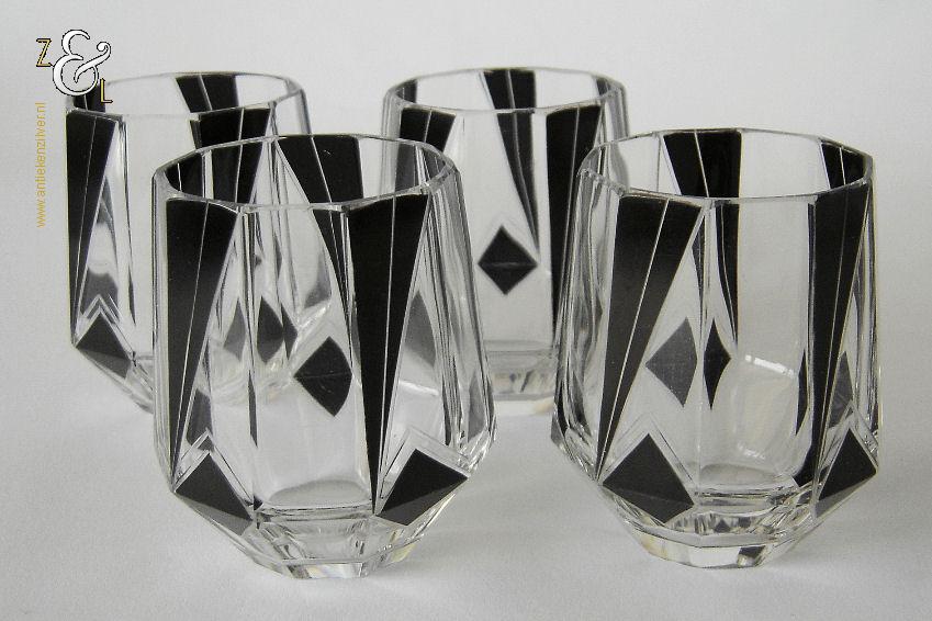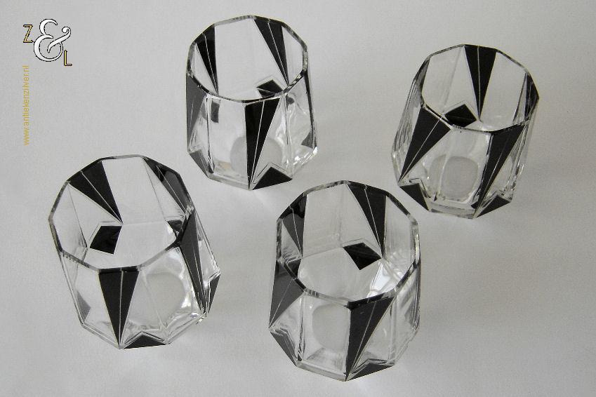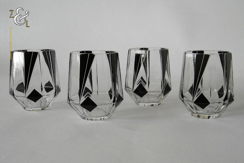 Deze karaf en 4 glazen zijn gemaakt in Tsjechië – Bohemen bij de Firma Karl Palda en stammen uit de Art Deco periode (omstreeks 1930). De in hoogwaardig helder kristal uitgevoerde karaf en glazen zijn op de hand symmetrisch facetgeslepen, gepolijst en geometrisch zwart geëtst. De karaf en stop zijn genummerd (12) en aan de onderzijde heeft de karaf een in de vorm van een lens weggeslepen pontilmerk (zie afbeeldingen met geel omkaderde gedeeltes). De karaf en 4 glazen wegen samen 1390 gram. De tienkantige glazen hebben een diameter van 5.5 cm en zijn 6 cm hoog, de karaf is 19.5 cm lang bij 9.5 cm breed bij 20.7 cm hoog. De karaf en glazen hebben lichte gebruikssporen. De karaf heeft een héél lichte aanslag onderin de karaf (zie afbeelding).