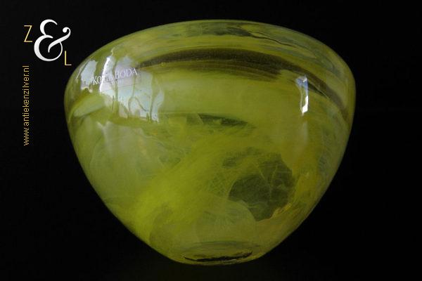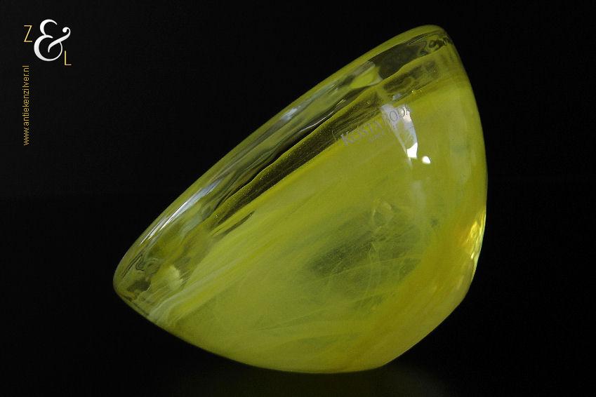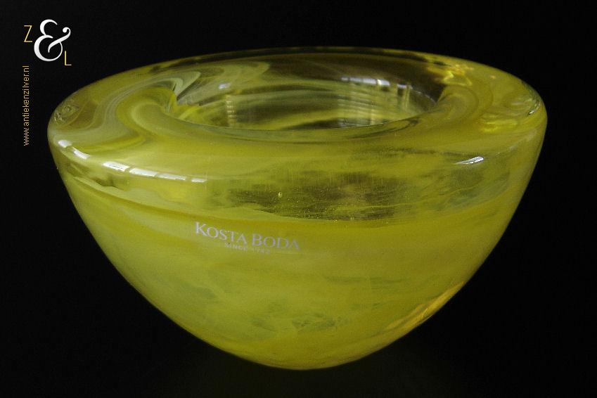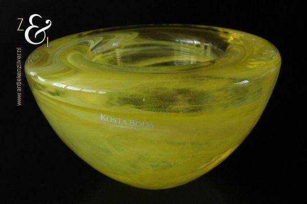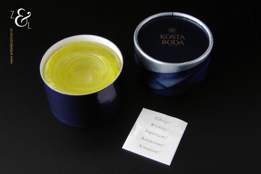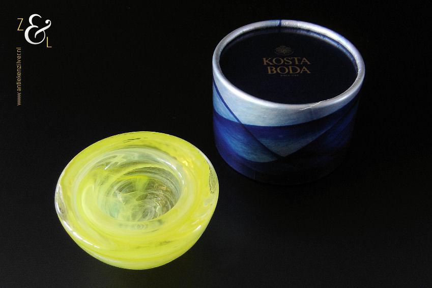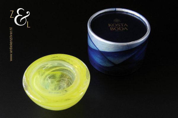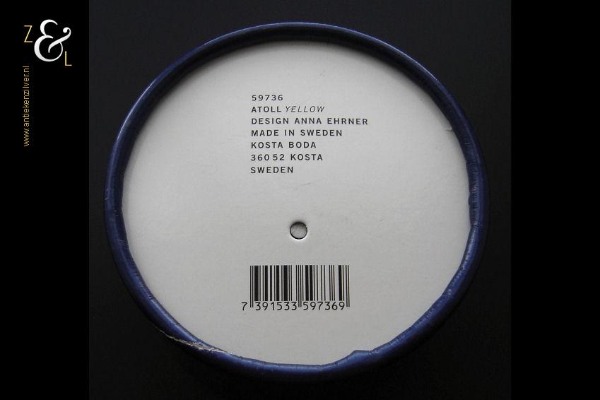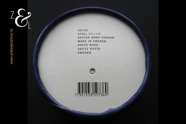 Dit theelicht / waxinelicht uit de serie Atoll is gemaakt in Småland Zweden bij de glasfabriek Kosta Boda. De serie Atoll die uit meerdere schalen bestaat is een ontwerp van Anna Ehrner uit 1997. Het theelicht / waxinelicht dat het originele fabriekslabel “Kosta Boda since 1742” draagt, is op de hand gemaakt, met de mond geblazen en is uitgevoerd in een gesluierd dessin van transparant en geel gekleurd glas. Het theelicht / waxinelicht uit de serie Atoll weegt 336 gram heeft een diameter van 11 cm.
