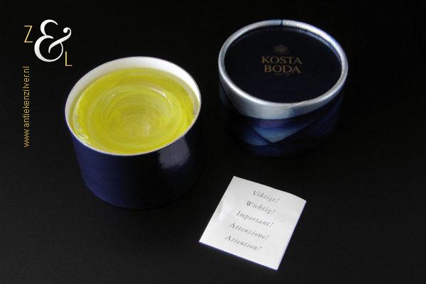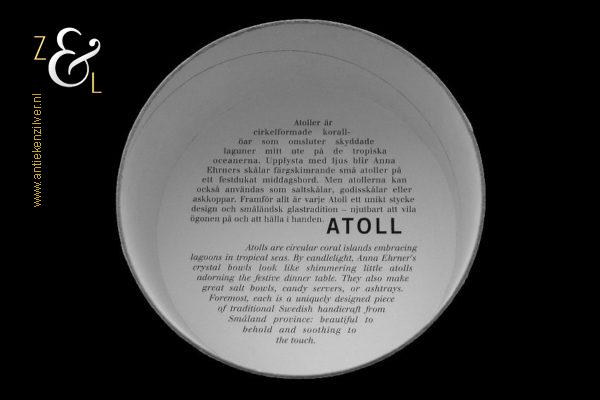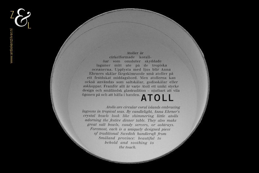 Het theelicht / waxinelicht uit de serie Atoll wordt aangeboden in de nog originele ronde doos waar aan de binnenkant van het deksel de tekst (vertaald in het Nederlands) staat: “Atollen zijn ringvormige koraal eilanden in tropische zeeën die lagunes omarmen. Bij kaarslicht lijken Anna Ehrner’s kristallen schalen op glinsterende kleine Atollen die de feestelijke dinertafel sieren. Ze zijn ook te gebruiken als zout vaatjes, dienschaaltjes voor snoep en als asbak. Maar het is vooral een uniek stuk design van traditioneel Zweeds handwerk uit de provincie Småland: prachtig om te bekijken en rustgevend om aan te raken”.