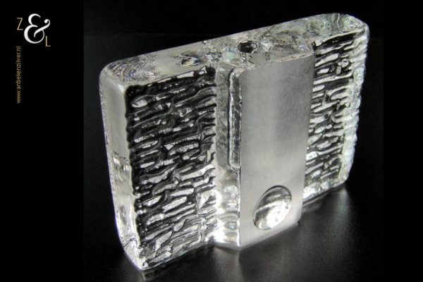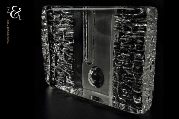 Deze in helder glas uitgevoerde vaas is in de zeventiger jaren ontworpen door Heiner Düsterhaus en gemaakt bij de Duitse glas fabrikant Walther Glas. De vaas die voor één bloem (solifleur) ontworpen is kan ook worden gebruikt als een kandelaar. De vaas weegt 1009 gram is 9.8 cm hoog 13.7 cm lang en 3.8 cm breed.