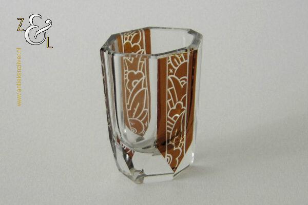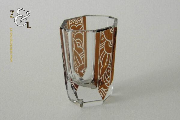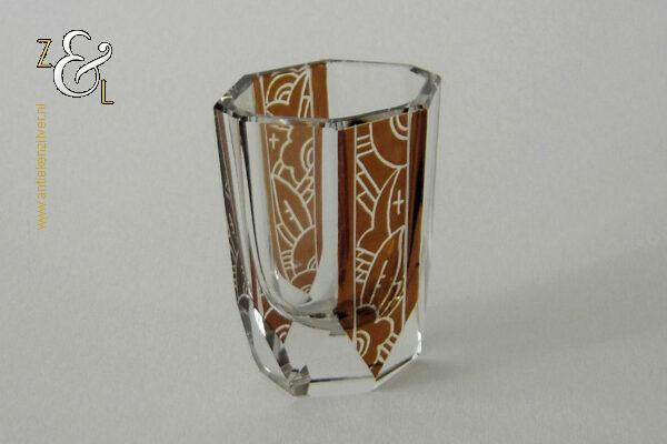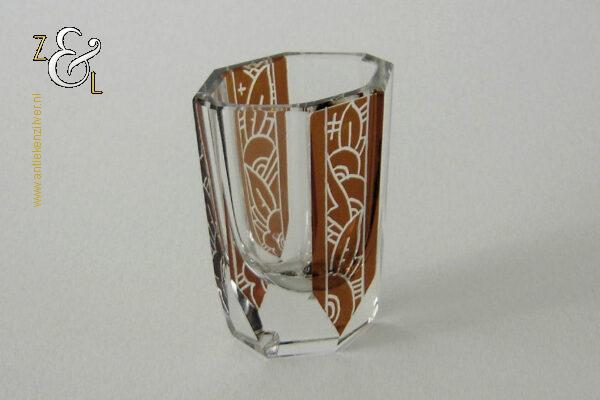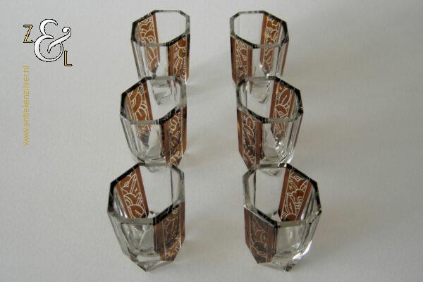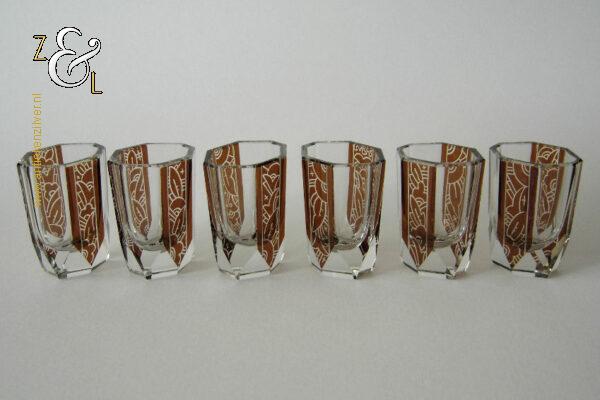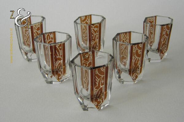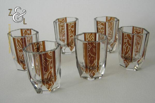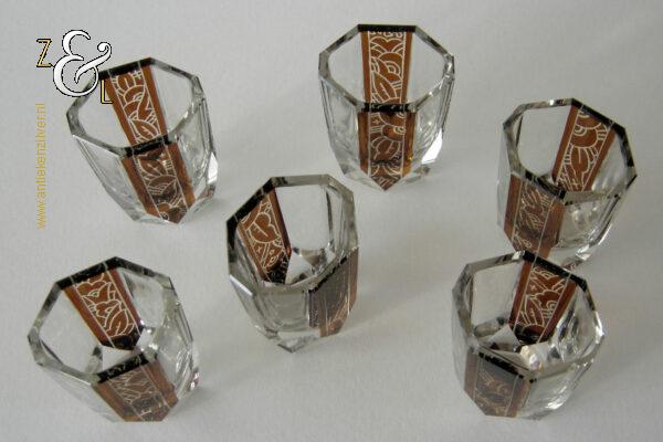 Deze zes glazen zijn gemaakt in Tsjechië – Bohemen bij de Firma Karl Palda en stammen uit de Art Deco periode (omstreeks 1930). De in hoogwaardig helder kristal uitgevoerde glazen zijn op de hand symmetrisch facetgeslepen, gepolijst en elk glas is voorzien van een verschillend bruin geëtste geometrische decoratie. De zes achtkantige likeurglazen wegen samen 616 gram en zijn 4.8 cm lang bij 3.8 cm breed bij 6.5 cm hoog.