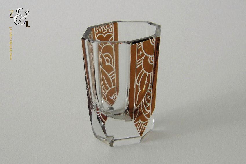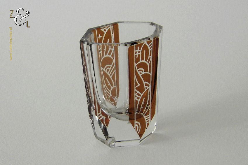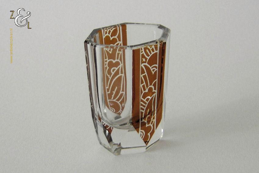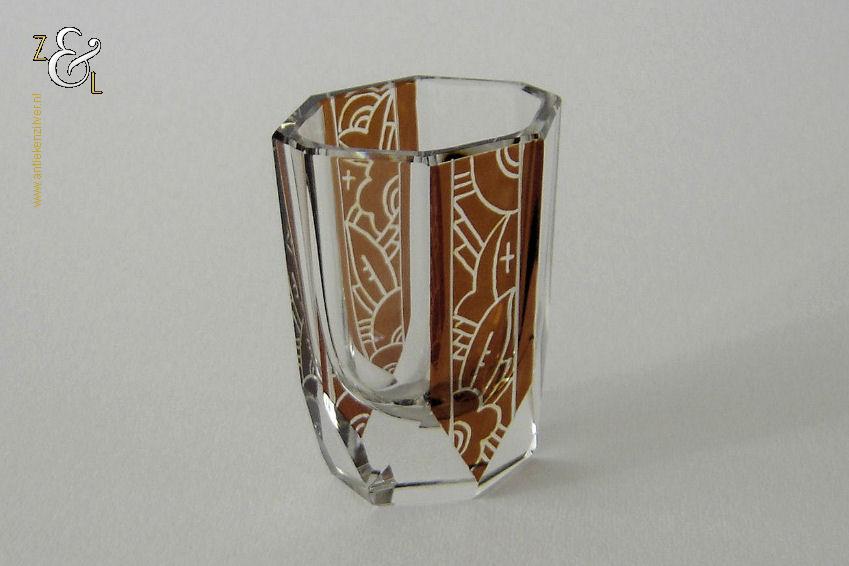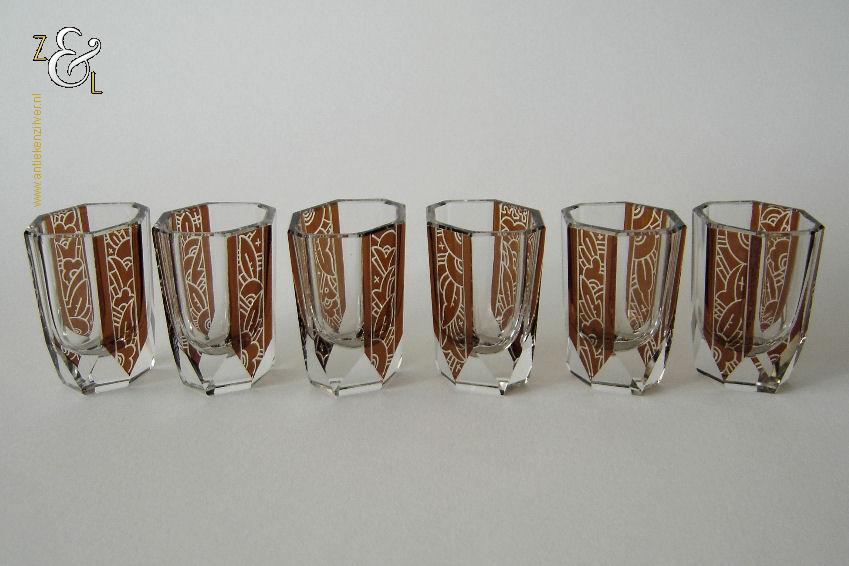 Deze zes glazen zijn gemaakt in Tsjechië – Bohemen bij de Firma Karl Palda en stammen uit de Art Deco periode (omstreeks 1930). De in hoogwaardig helder kristal uitgevoerde glazen zijn op de hand symmetrisch facetgeslepen, gepolijst en elk glas is voorzien van een verschillend bruin geëtste geometrische decoratie. De zes achtkantige likeurglazen wegen samen 616 gram en zijn 4.8 cm lang bij 3.8 cm breed bij 6.5 cm hoog.