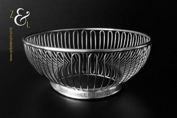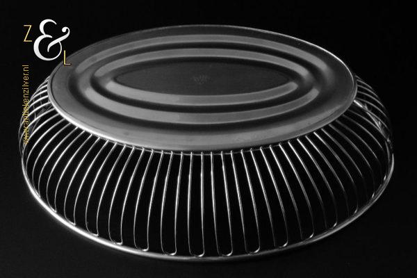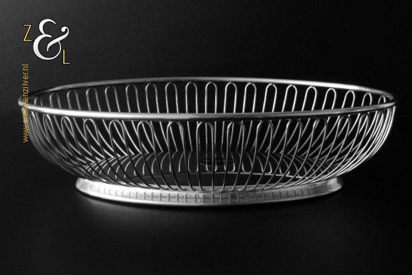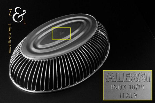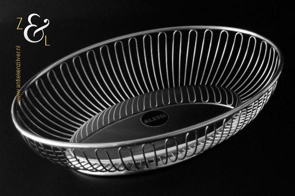 Deze ovale draadmand / broodmand / fruitmand model 829 is gemaakt in Italië door Alessi* naar een ontwerp uit 1955. De draadmand was het eerste object dat het resultaat was van het technologisch onderzoek naar gevouwen metaaldraad dat in de tweede helft van de jaren veertig door het technisch bureau van Alessi (Ufficio Tecnico Alessi) werd uitgevoerd. De design draadmand / broodmand / fruitmand met de sticker van Alessi, is aan de onderzijde gemerkt met ALESSI INOX 18/10 ITALY en gemaakt van roestvast / roestvrij staal: inox 18/10 (een austenitisch corrosievast chroomnikkelstaal met een samenstelling van 18% chroom en 10% nikkel). De metalen draadmand is 28 cm lang bij 20 cm breed bij 7 cm hoog. De draadmand / broodmand / fruitmand heeft lichte gebruikssporen.