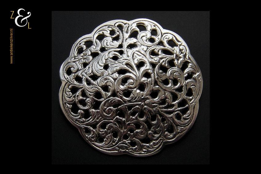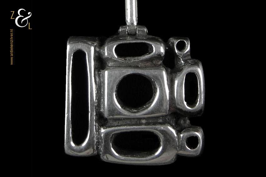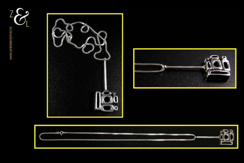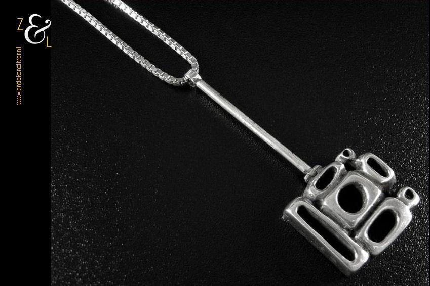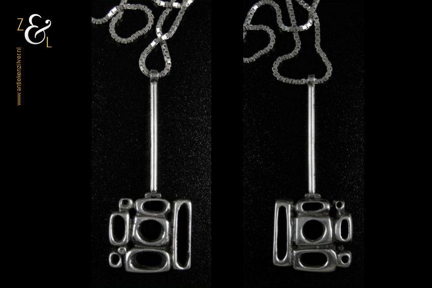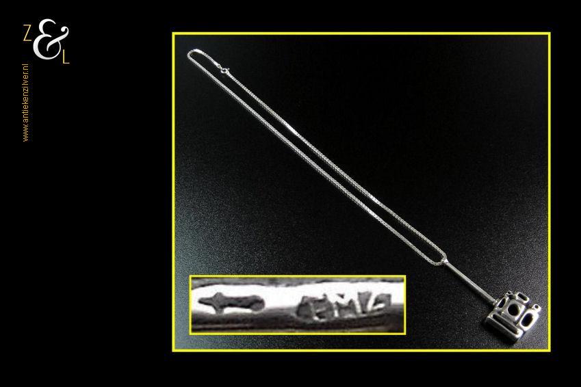 Mooie zeventiger jaren halsketting met hanger. De hanger is ontworpen en gemaakt door edelsmid Menno Meijer (meesterteken FM2 in zeshoek) in Gouda Nederland. De zilveren hanger meet 7.2 cm bij 2.8 cm en de zilveren ketting is 58 cm lang, samen wegen zij 50 gram.