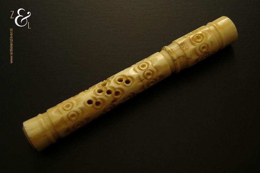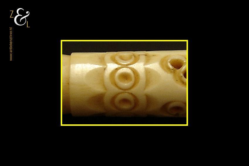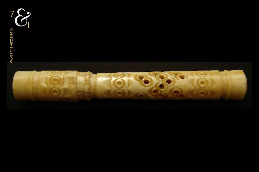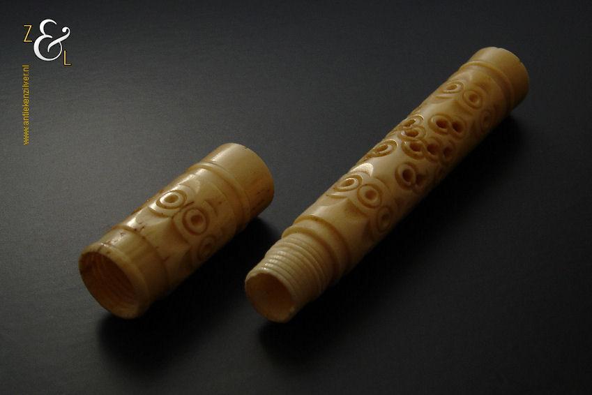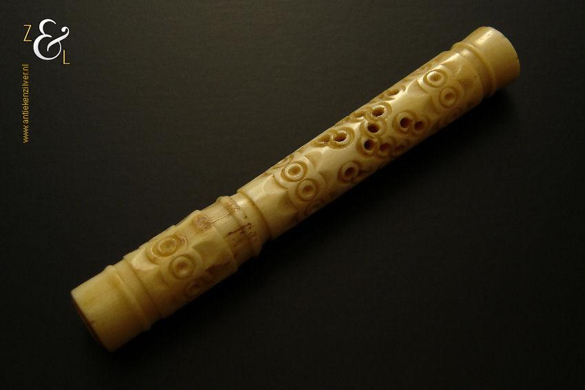 Deze ajour (opengewerkte) naaldenkoker is gemaakt in Engeland en stamt uit het einde van de 19e eeuw de Victoriaanse periode die liep van 1837 tot 1901. De in been uitgevoerde handgesneden naaldenkoker weegt 14 gram heeft een diameter van 1.3 cm en is 9.3 cm lang. De dop heeft een schroefdraad en is 3.2 cm lang.