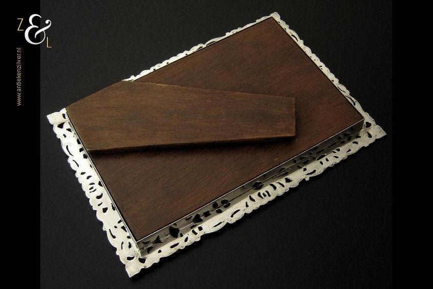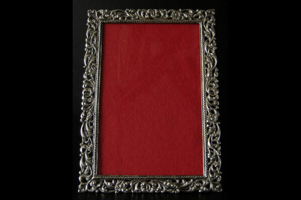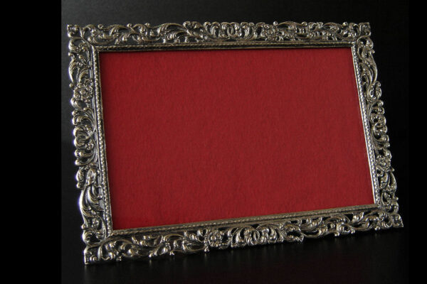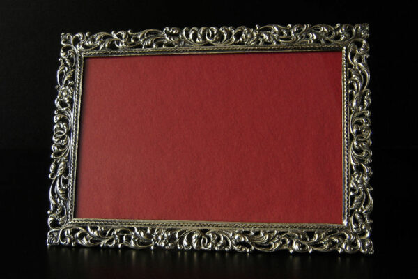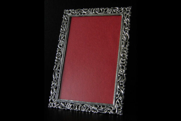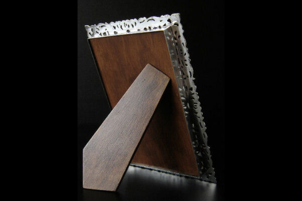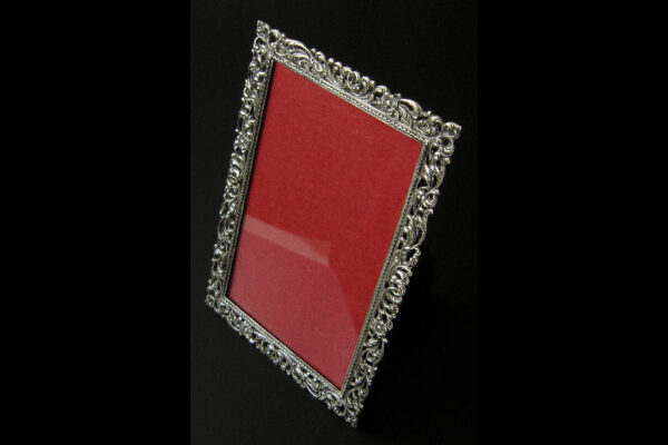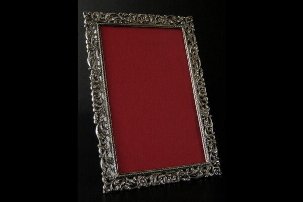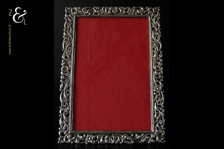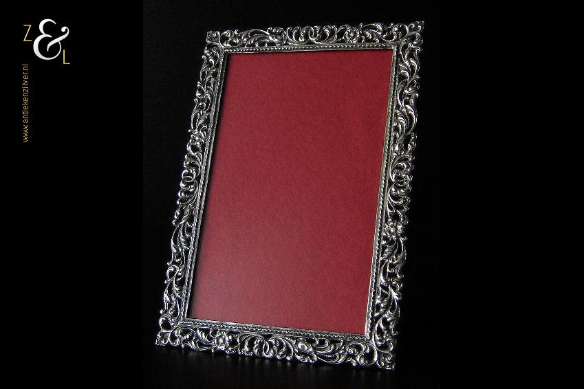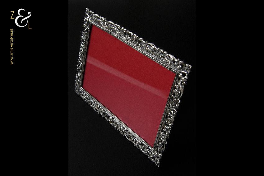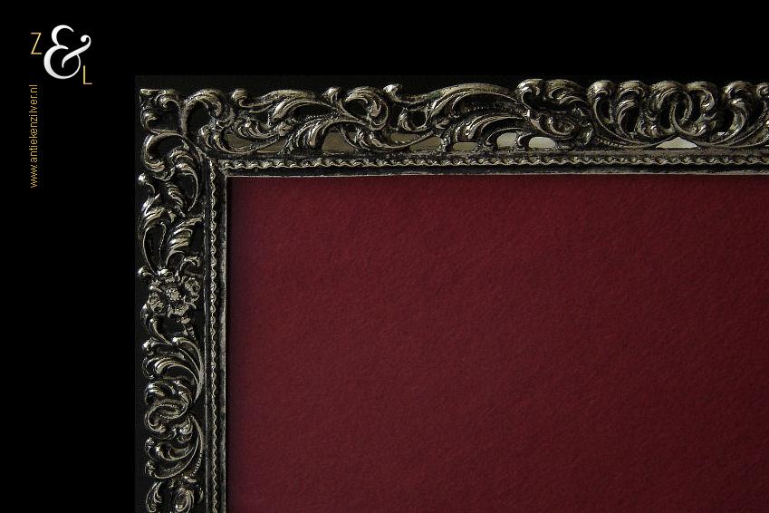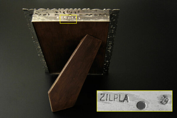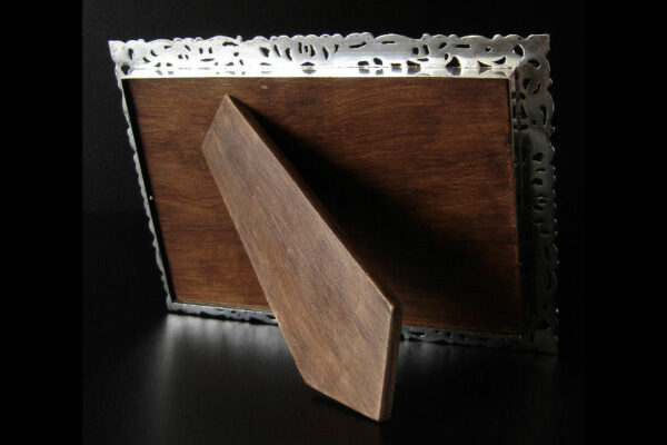 Deze verzilverde / pleet / plate fotolijst is gemaakt in Nederland en stamt uit de eerste helft van de 20e eeuw (omstreeks 1940). De ajour gegoten rechthoekige fotolijst is gemerkt met ZILPLA (ZILver PLAted) en een rond stempel met “90” wat de zwaarte van verzilvering aangeeft. De fotolijst weegt inclusief glas en achterkant 246 gram en is 18.1 cm lang bij 12.7 cm breed. De fotolijst is geschikt voor foto’s van 15 cm bij 9.5 cm en is te gebruiken voor zowel liggende als staande foto’s. De achterkant zit stevig vastgeklemd in de lijst maar kan vastgezet worden met spijkertjes (messing spijkertjes worden bijgeleverd).