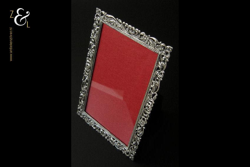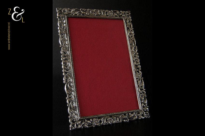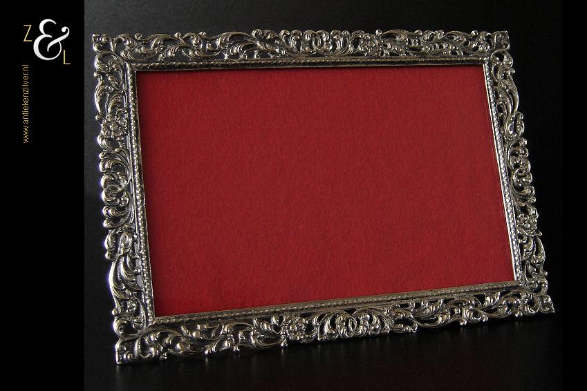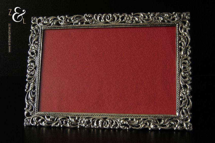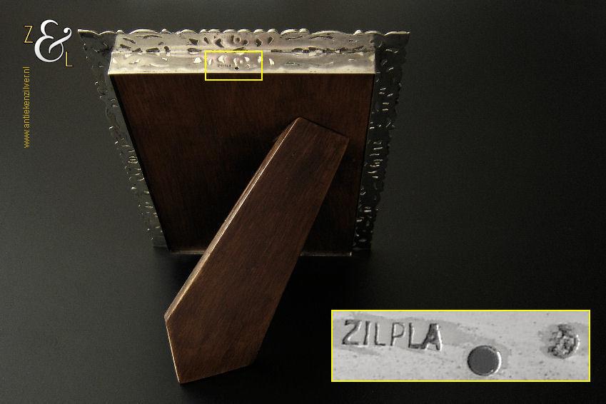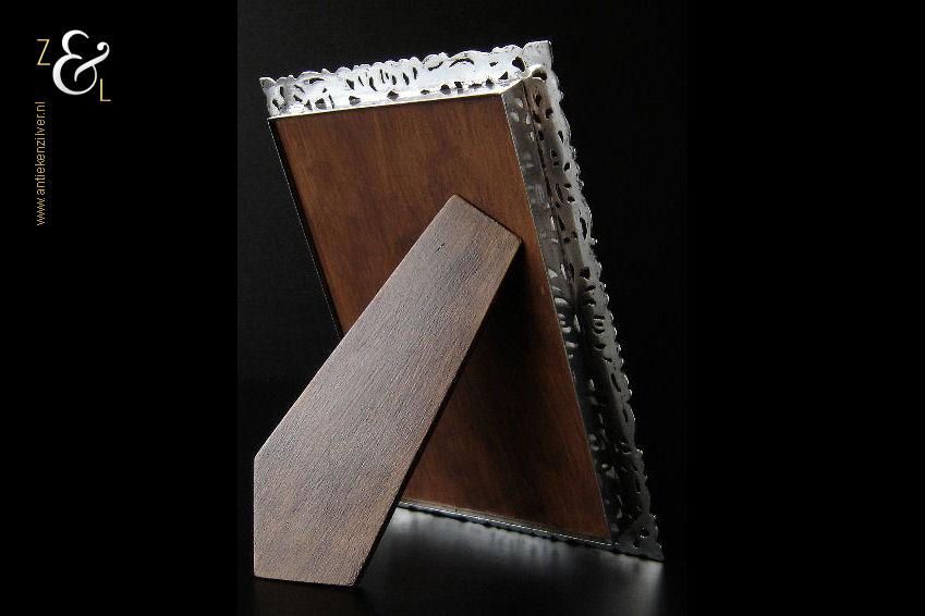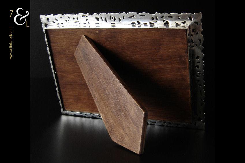 Deze verzilverde / pleet / plate fotolijst is gemaakt in Nederland en stamt uit de eerste helft van de 20e eeuw (omstreeks 1940). De ajour gegoten rechthoekige fotolijst is gemerkt met ZILPLA (ZILver PLAted) en een rond stempel met “90” wat de zwaarte van verzilvering aangeeft. De fotolijst weegt inclusief glas en achterkant 246 gram en is 18.1 cm lang bij 12.7 cm breed. De fotolijst is geschikt voor foto’s van 15 cm bij 9.5 cm en is te gebruiken voor zowel liggende als staande foto’s. De achterkant zit stevig vastgeklemd in de lijst maar kan vastgezet worden met spijkertjes (messing spijkertjes worden bijgeleverd).