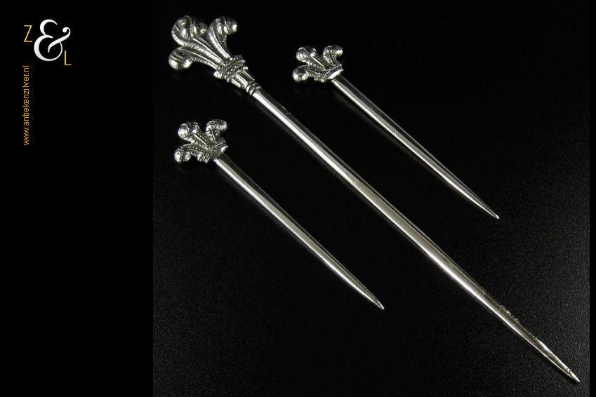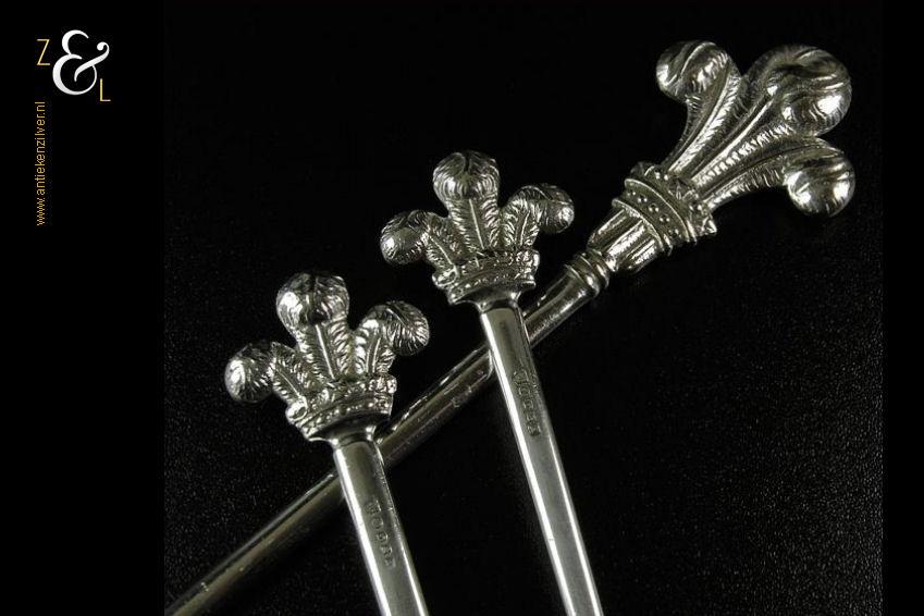 Deze set van een grote en twee kleine verzilverde vleespennen of spiesen zijn bekroond met de Prince of Wales Feathers. De vleespennen zijn eind 19e eeuw door Daniël & Arter zilversmeden en electroplaters te Birmingham Engeland gemaakt. De twee kleine vleespennen zijn gekeurd met D & A in achthoeken wat staat voor Daniël & Arter en een anker in een schild wat staat voor het Birmingham Assay Office, de grote vleespen is niet gekeurd. De vleespennen wegen samen 128 gram, de grote vleespen is 27.5 cm lang en de twee kleine vleespennen zijn 14 cm lang.