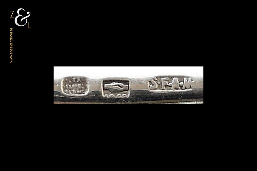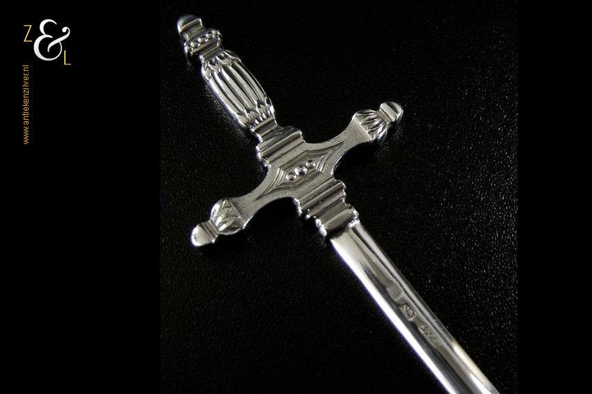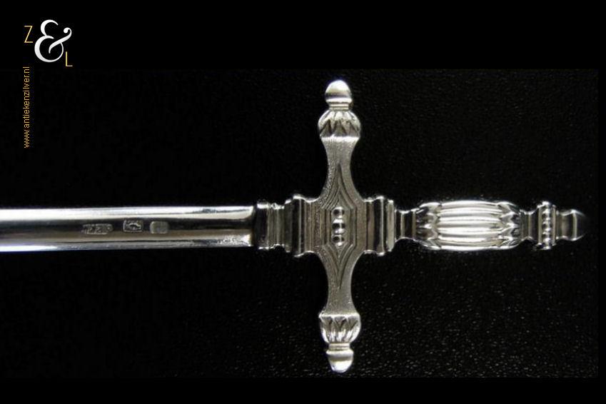 Deze verzilverde vleespen of spies is uitgevoerd in de vorm van een zwaard. De vleespen is eind 19e eeuw gemaakt in Frankrijk en gemerkt met een rechthoekig stempel met de inscriptie S.F.A.M. dit was een zilver en zilverpleet fabriek opgericht in 1894 te Chambly Noord Frankrijk. Het merk S.F.A.M. staat nu voor de Chambly zilver Company die in Parijs actief is. Tevens heeft de spies een rechthoekig stempel waarin staat Métal Alliange Blanc (als drie regels) dit is een merk dat aangeeft dat we met Frans zilverpleet te maken hebben en een rechthoekig stempel waarin twee handen (elkaar handen schuddend) met daaronder 12gr dit is een merk dat refereert naar de kwaliteit van hoe zwaar het stuk verzilverd is. De vleespen weegt 35 gram is 24 cm lang en het zwaard meet 4.1 cm bij 5 cm.