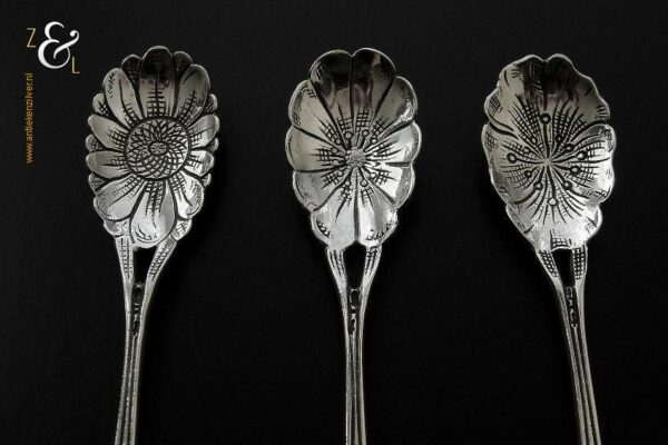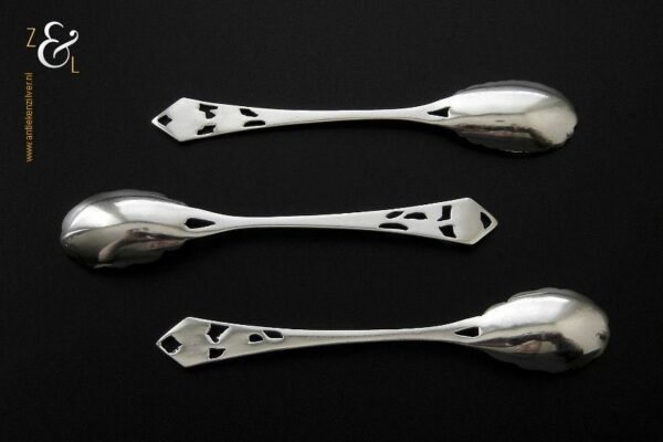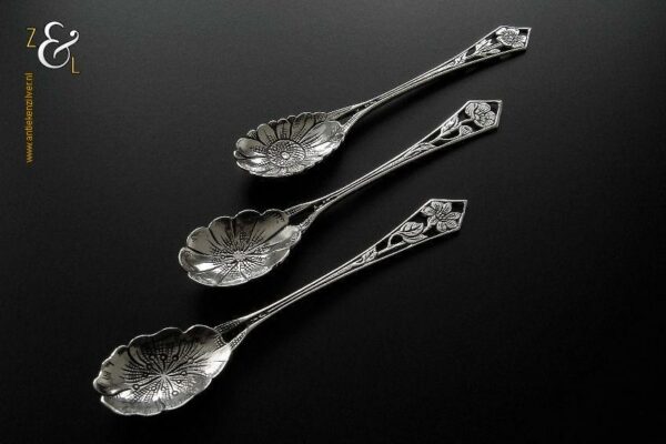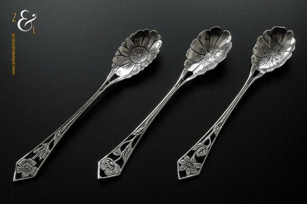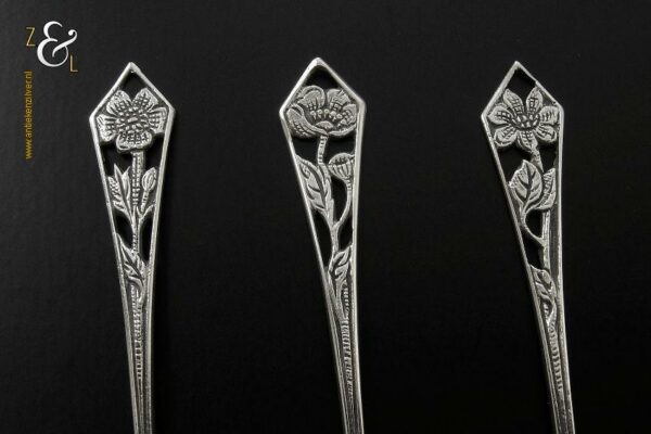Deze drie koffie- theelepels zijn gemaakt in Schoonhoven door H. Hooijkaas (meesterteken *H.H* in langwerpige zeshoek) omstreeks 1950 (gekeurd met het zilverkeur zwaardje). De drie zilveren koffie- theelepels hebben puntig toelopende ajour stelen met bloemen en de bakken zijn tevens in de vorm van een bloem. De koffie- theelepels zijn 11 cm lang en wegen samen 25 gram. Deze lepels zijn goed te combineren met artikel nummer 10472 (3 Koffielepels / Theelepels).
