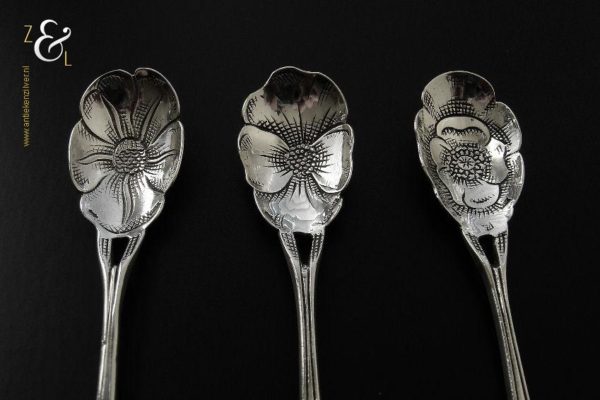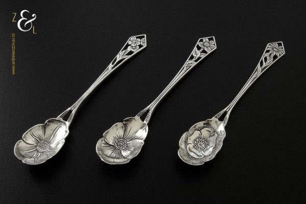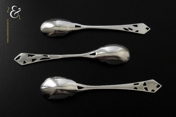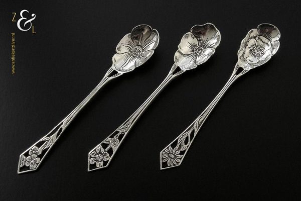Deze drie koffie- theelepels zijn gemaakt in Haarlem door de Firma Th. & P. Moerkerk & Co. (meesterteken M14C in zeshoek) omstreeks 1950 (gekeurd met het zilverkeur zwaardje). De drie zilveren koffie- theelepels hebben puntig toelopende ajour stelen met bloemen en de bakken zijn tevens in de vorm van een bloem. De koffie- theelepels zijn 11 cm lang en wegen samen 25 gram. Deze lepels zijn goed te combineren met artikel nummer 10471 (3 Koffielepels / Theelepels).