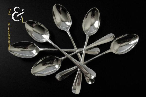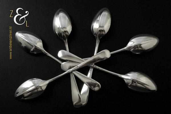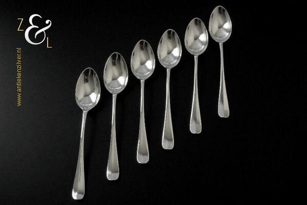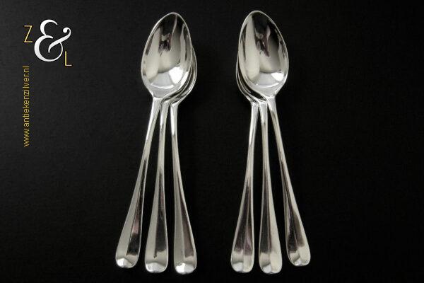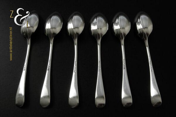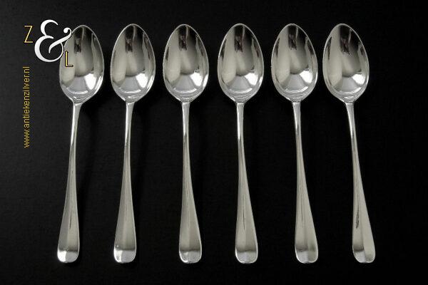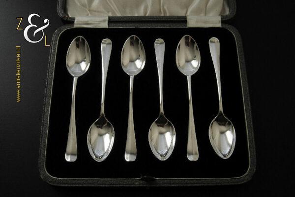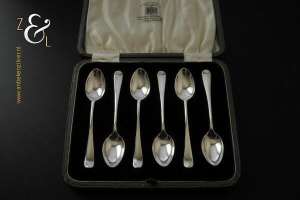 Deze 6 koffielepels / theelepels / demitasselepels* zijn gemaakt in Birmingham bij de zilversmederij Docker & Burn Ltd. (meesterteken D&B in rechthoek met afgeronde hoeken) in het jaar 1922 (jaarletter X). De koffielepels / theelepels / demitasselepels hebben het originele grijze foedraal (heeft gebruikssporen) met aan de binnenzijde van het deksel de tekst: By Royal Appointment to H.M. The King Curtis and Horspool Goldsmiths & Silversmiths Leicester (de verkopende winkelier). De koffielepels / theelepels / demitasselepels waarvan de stelen een middenlijn en aan het uiteinde een lofje (in Nederland “Haags lof” genoemd) hebben, zijn aan de achterzijde van de bak met een zogenaamde rattenstaart / rattail uitgevoerd. De 1e gehalte sterling zilveren koffielepels / theelepels / demitasselepels die uit de George V 1910-1936 periode stammen wegen samen 77 gram en zijn 11.2 cm lang. Het foedraal is 17.5 cm lang bij 15 cm breed bij 3 cm hoog.