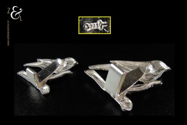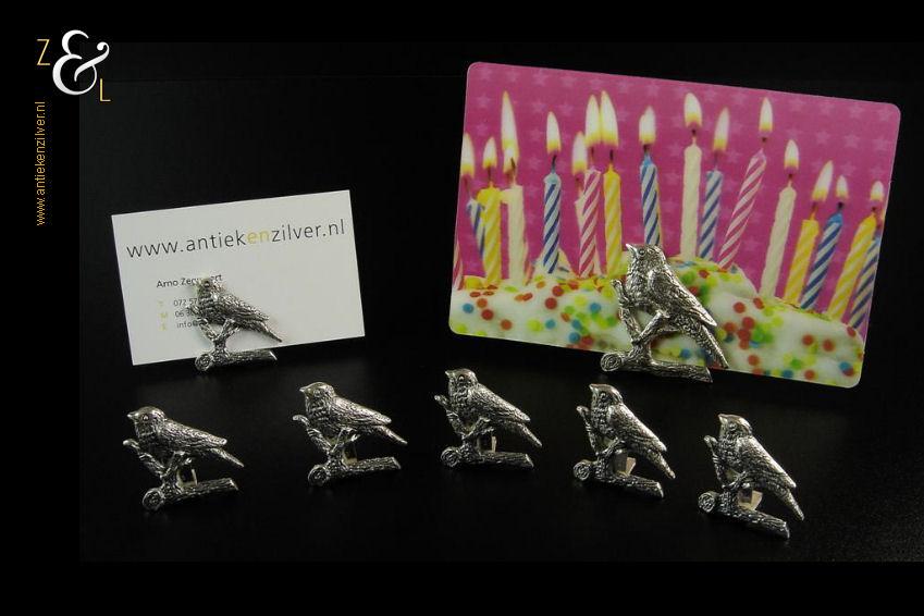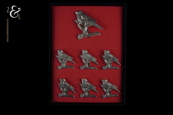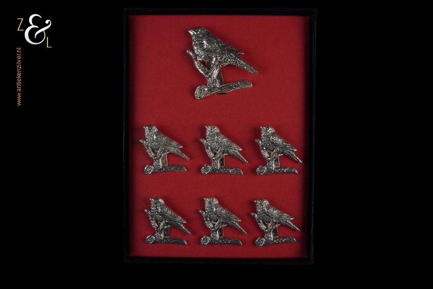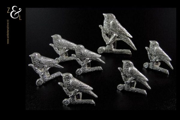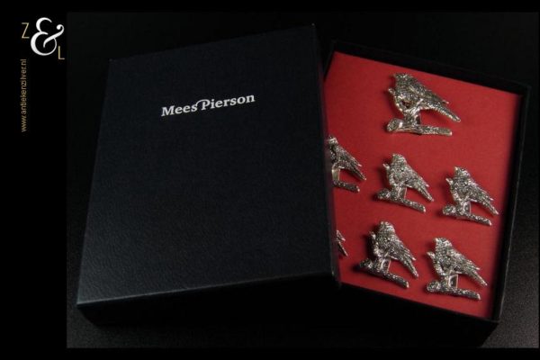 Doos met 7 zilveren menukaarthouders te weten één grote menukaarthouder van 4.7 cm hoog en 4.5 cm breed en 6 Kleine menukaarthouders van 3.3 cm hoog en 3.5 cm breed. De menukaarthouders zijn gestempeld met het Nederlandse zilverkeur zwaardje waarin 925 dat staat voor eerste gehalte zilver. De menukaarthouders in de vorm van een roodborstje op een tak wegen samen 67 gram en zitten in een doos met het opschrift MeesPierson (blijkbaar is dit een relatiegeschenk van de MeesPierson bank geweest). De doos is 18 cm lang bij 14 cm breed bij 3 cm hoog.