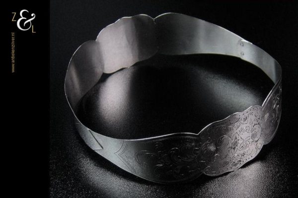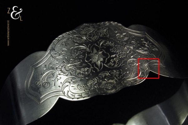 Deze armband voor een kluwenspeld* is gemaakt in Utrecht / Maarssen door Willem Snijders (meesterteken WS boven klaver in vierkant) tussen de jaren 1830 en 1838 (gekeurd met het zilverkeur zwaardje). De zilveren Biedermeier armband waarvan zowel de voor- als achterzijde met c-vormige voluten en bloemmotieven gegraveerd is weegt 24 gram heeft een diameter van 10 cm en is 3.3 cm breed. Deze armband voor een kluwenspeld is een bijzonder stukje naaigerei dat nog maar weinig voorkomt. De armband heeft een klein scheurtje (zie rode kader op de afbeelding).