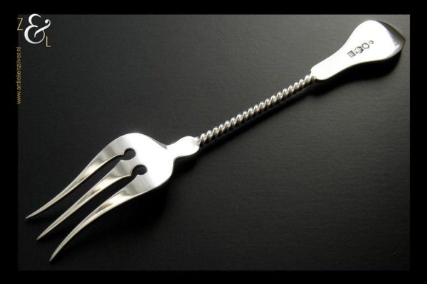 Belegvork / zuurvork gemaakt in Voorschoten bij de Firma J.M. van Kempen & Zonen (meesterteken liggend maantje tussen punten boven VK in vierkant) in het jaar 1897 (jaarletter N). Deze zilveren Jugendstil belegvork / zuurvork heeft een getordeerde steel en handvat met parelrand. De belegvork / zuurvork weegt 31 gram en is 16.6 cm lang.