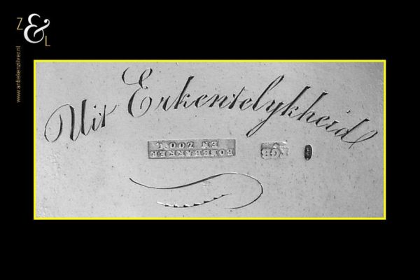 Deze bonbonmand / suikerklontenmand is gemaakt in Amsterdam door Theodorus Gerardus Bentveld (meesterteken TGB boven + in rechthoek) en Jan Berend Schöne (meesterteken S boven 1 in ovaal) in het jaar 1850 (jaarletter Q). De bonbonmand / suikerklontenmand heeft tevens het winkeliersmerk van Bonebakker en Zoon, deze firma is sinds 1792 bekend vanwege de verkoop van zilveren voorwerpen van zéér hoge kwaliteit. De op de hand gedreven zilveren bonbonmand / suikerklontenmand is voorzien van een gegoten hengsel en voeten die uitgerust zijn met c-vormige voluten en bloemmotieven. Verder heeft de bonbonmand / suikerklontenmand aan de bovenzijde een accoladerand en de hoeken zijn voorzien van een ruitmotief. De Biedermeier bonbonmand / suikerklontenmand weegt 342 gram is 15.5 cm lang 13 cm breed en is met het hengsel omhoog 16.7 hoog. Aan de onderzijde is de bonbonmand / suikerklontenmand gegraveerd met de tekst: “Uit Erkentelijkheid”. Blijkbaar was de mand een cadeau van een gever die de ontvanger ergens dankbaar voor is geweest.