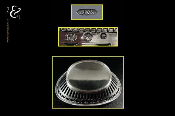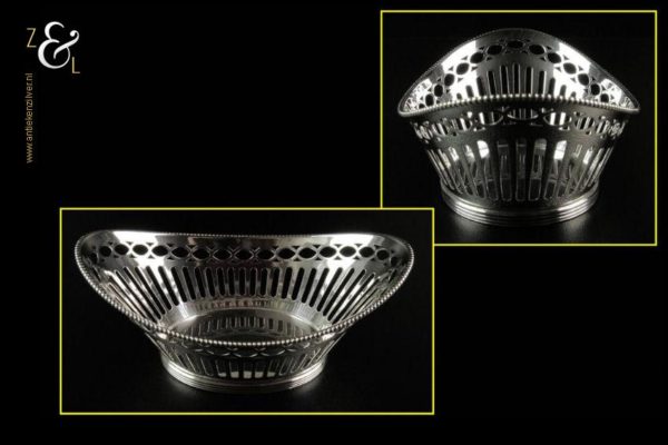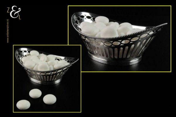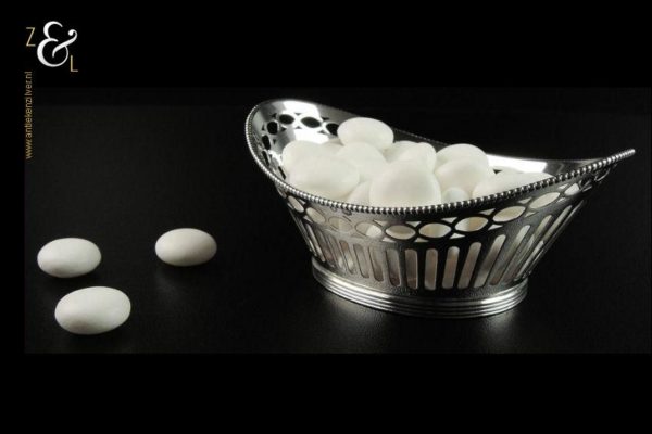 Bonbonmandje gemaakt in Schoonhoven door J. Krins (meesterteken J driehoek K. in langwerpige zeshoek) in het jaar 1964 (jaarletter E). Dit uitgezaagde zilveren bonbonmandje met parelrand weegt 56 gram en is 11.9 cm lang 7.8 cm breed en 4.6 cm hoog. Ook goed te gebruiken als pepermuntmandje voor na het diner.