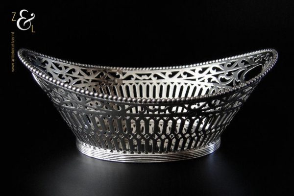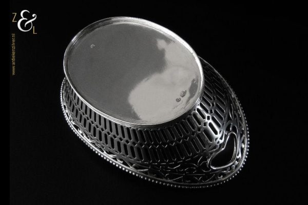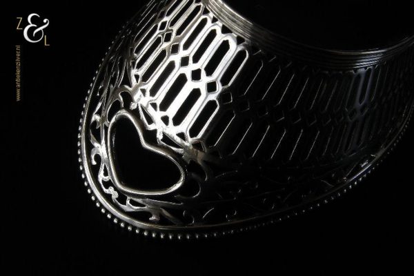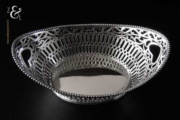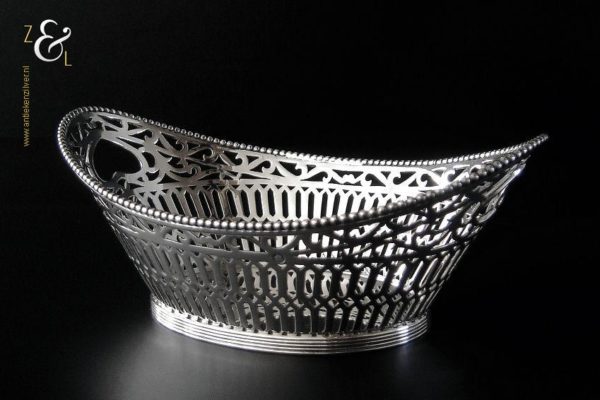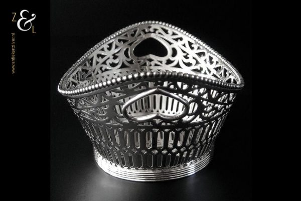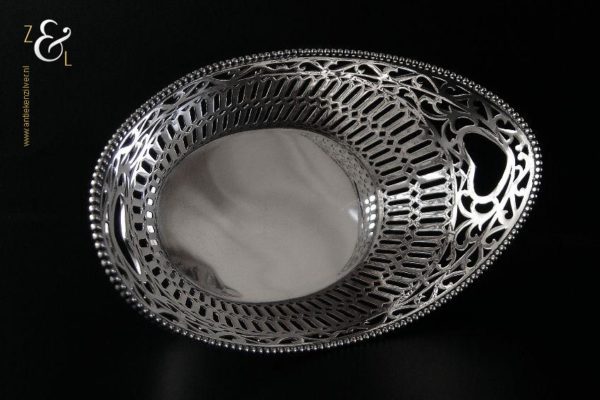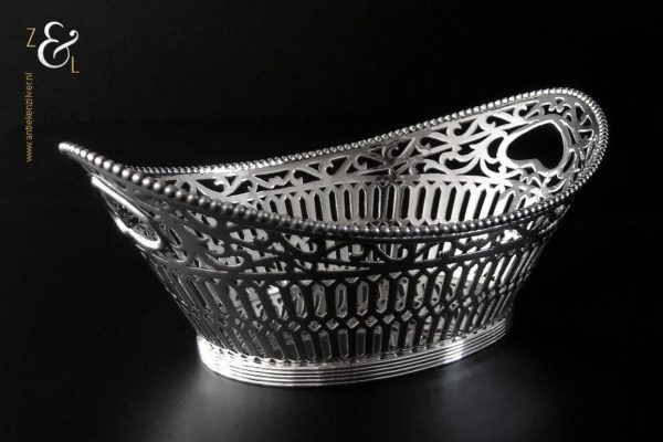Bonbonmandje gemaakt in Voorschoten door de Firma J.M. van Kempen & Zonen (meesterteken liggend maantje tussen punten boven VK in vierkant) in het jaar 1918 (jaarletter I). Het op de hand uitgezaagde schuitvormige zilveren bonbonmandje heeft langs de bovenkant een parelrand en aan de onderkant een filetrand. Het mandje weegt 144 gram is 16 cm lang 10 cm breed en 6.2 cm hoog.