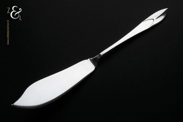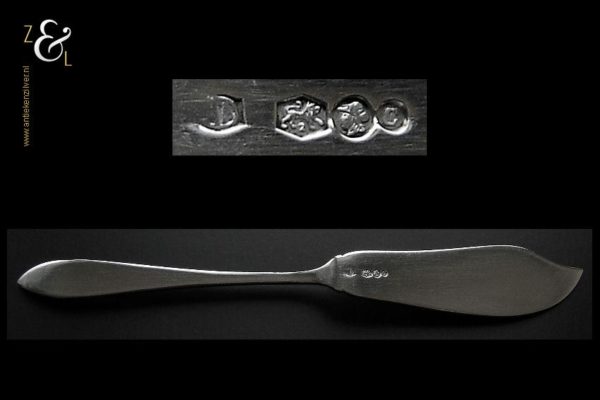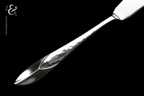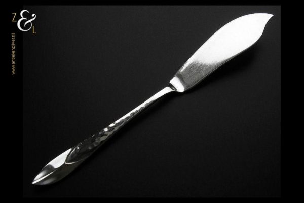 Botermes gemaakt in Zeist door Gerritsen & van Kempen (meesterteken V.K. in G) in het jaar 1937 (jaarletter C). Het gehamerde zilveren Art Deco botermes model 210 weegt 31 gram en is 16.5 cm lang.