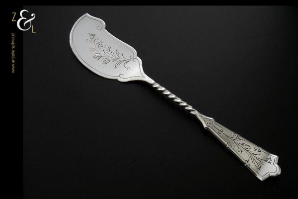 Boterspatel gemaakt in Schoonhoven door J. van Os van den Abeelen (meesterteken OA in vierkant) in het jaar 1912 (jaarletter C). Deze in Art Nouveau uitgevoerde en met bloemmotieven gegraveerde zilveren boterspatel weegt 25 gram en is 16.2 cm lang.