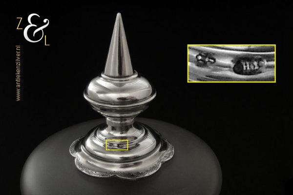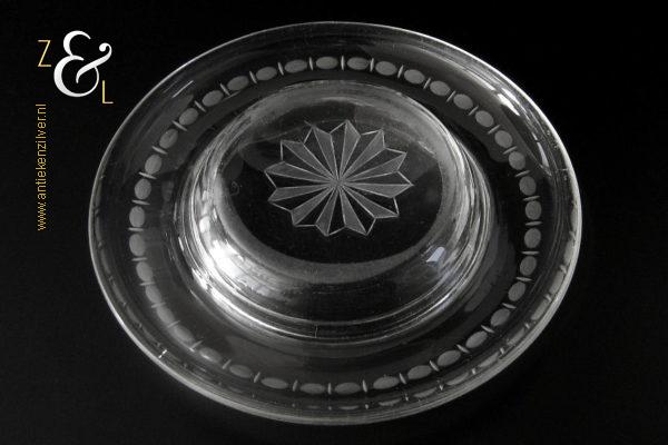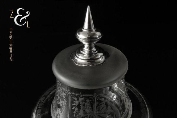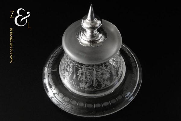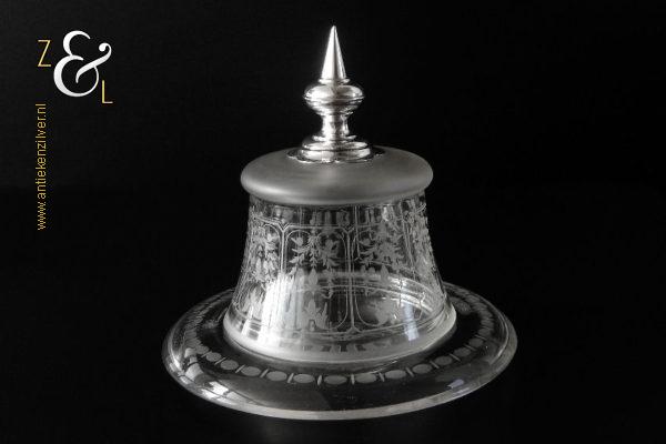 Van deze in Biedermeier stijl uitgevoerde botervloot is de zilveren knop gemaakt in Nederland door een voor ons onbekend zilversmid (meesterteken niet goed leesbaar H ster?) omstreeks de eerste helft van de 19e eeuw. De zilveren knop (torenknop) waarvan de bovenkant uitloopt in een punt en die aan de onderzijde een fijntjes gegraveerde geschulpte rand heeft is gekeurd met het zilverkeur zwaardje (dit is het gehaltemerk voor kleine zilveren werken) dat tussen 1814 en 1905 in gebruik was. Tevens staat op de rand van de knop naast het zwaardje het niet goed leesbare meesterteken. De mondgeblazen klokvormige kristallen / glazen stolp waarvan de bovenzijde geheel mat geëtst is heeft aan de zijkant negen geëtste vensters waarin guirlande motieven afgebeeld zijn. De schotel heeft een geëtste rand van olijven en heeft aan de onderzijde een fraaie geëtste ster. De botervloot weegt 627 gram en is 16.8 cm hoog. De schotel heeft een diameter van 18.1 cm en de stolp heeft een diameter van 11.8 cm. Het vaste binnenbakje heeft een diameter van 10.5 cm en is 2.5 cm diep.