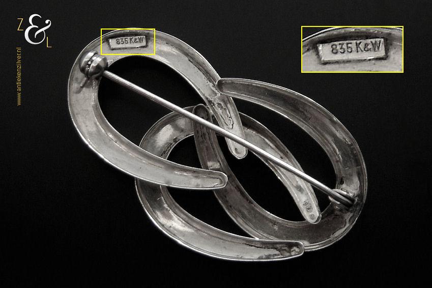 Deze broche is geïmporteerd door de importeur voor de Nederlandse markt A.W.G. Wels te Amsterdam (meesterteken K&W) tussen 1966 en 1984. De stilistisch gevormde zilveren zeventiger jaren design broche heeft een afsluitbare speld en is gekeurd met het zilverkeur 835 voor tweede gehalte zilver. Tevens heeft de broche aan de voorzijde het Nederlandse gehaltemerk ZII voor voorwerpen in voltooide staat aangeboden (zie foto met geel omkaderd gedeelte). De broche weegt 5 gram en is 4.3 cm lang bij 2.5 cm breed.