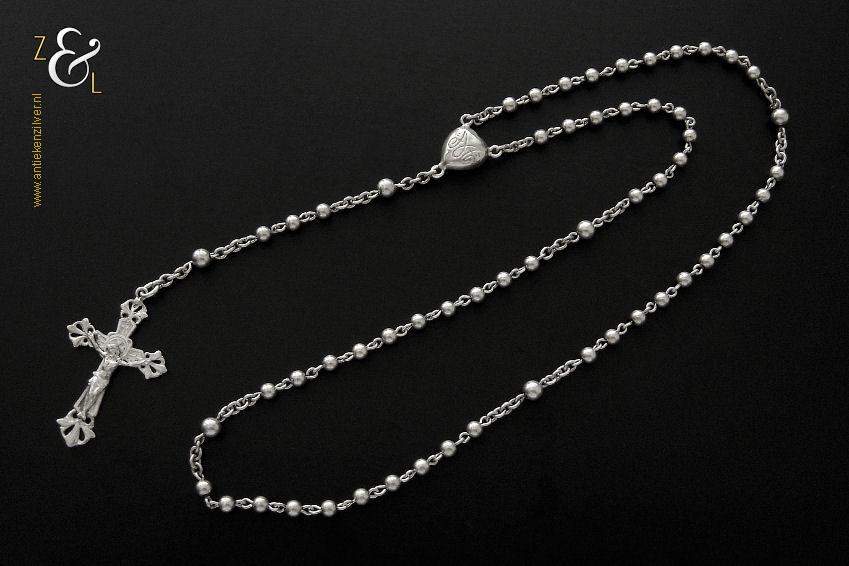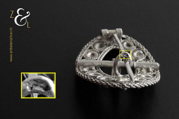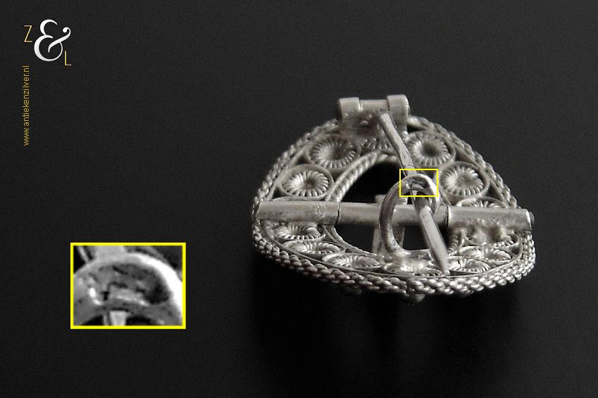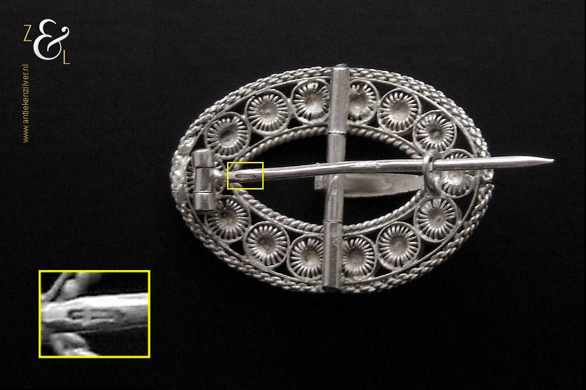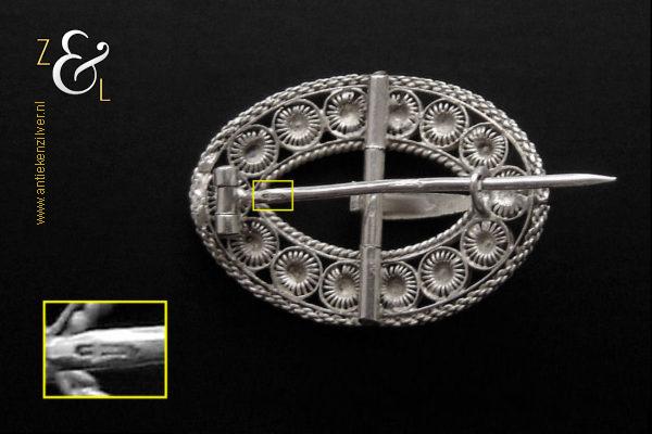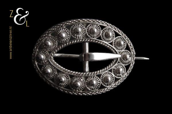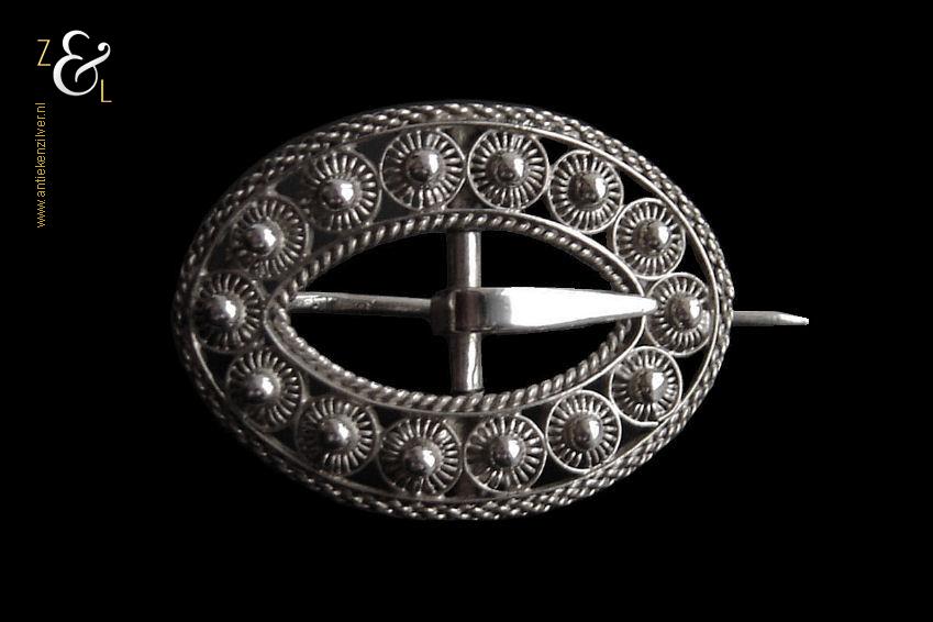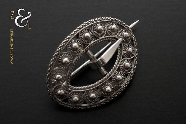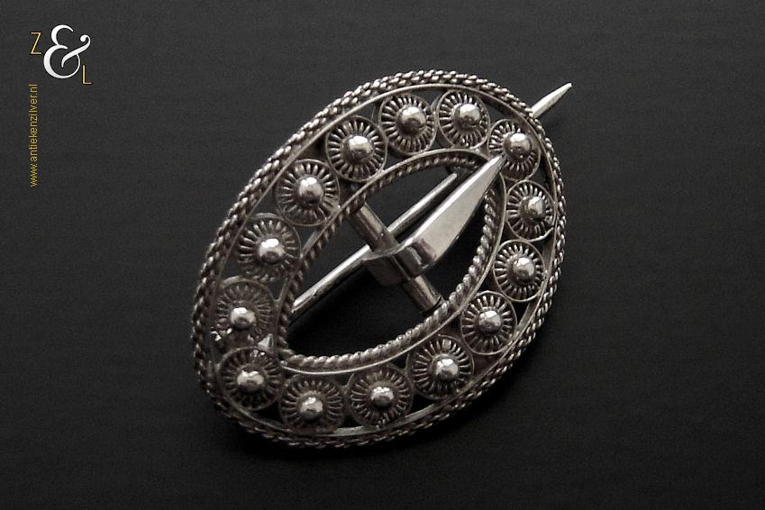 Deze zilveren broche is gemaakt van een antieke gesp (kuitgesp*) en stamt uit de provincie Zeeland in Nederland. Van de broche zijn de naald en krul gekeurd met het zwaardje (dit is het gehaltemerk voor kleine zilveren werken) dat tussen 1814 en 1905 in gebruik was. De op de hand gemaakte broche (gesp met originele tong) heeft veertien Zeeuwse knopjes (in opengewerkt filigrain*). Rondom de broche zit een rand met kettingmotief en aan de binnenkant zit een kabelrand. De broche weegt 5 gram en is 3.1 cm lang bij 2.2 cm breed.