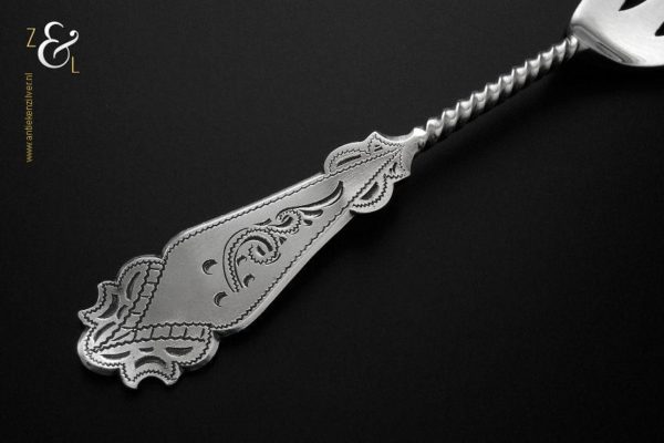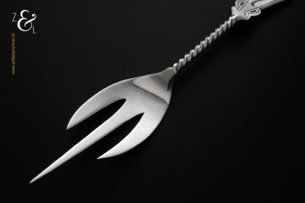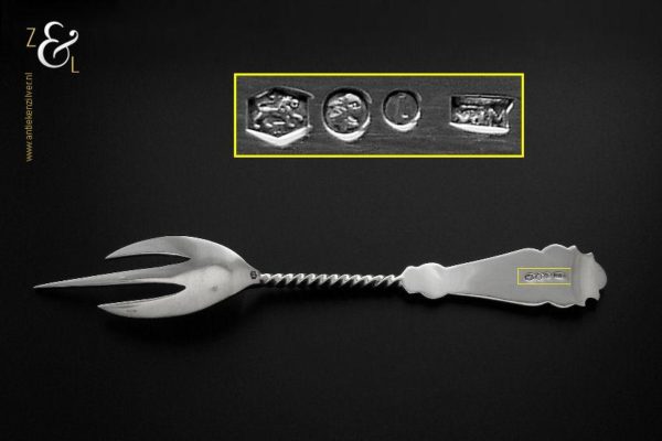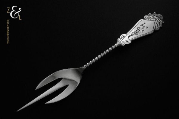 Cakevork / cakeprikker gemaakt in Joure Friesland door Wed. J.H. Van der Meulen (meesterteken vdM in rechthoek) in het jaar 1971 (jaarletter L). Deze zwaar uitgevoerde zilveren cakevork / cakeprikker heeft een gegraveerd en gematteerd (matteren is een bewerking waarbij de zilversmid het oppervlak van een zilveren voorwerp een matte structuur geeft) handvat en een getordeerde steel. De cakevork / cakeprikker weegt 43 gram en is 20 cm lang. Zilveren cakevorken / cakeprikkers zijn in de 20e eeuw ontstaan voor het presenteren van cake.