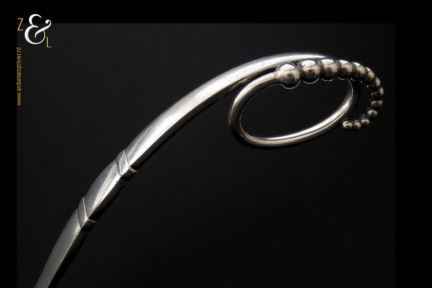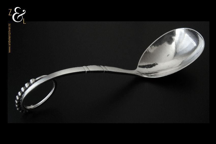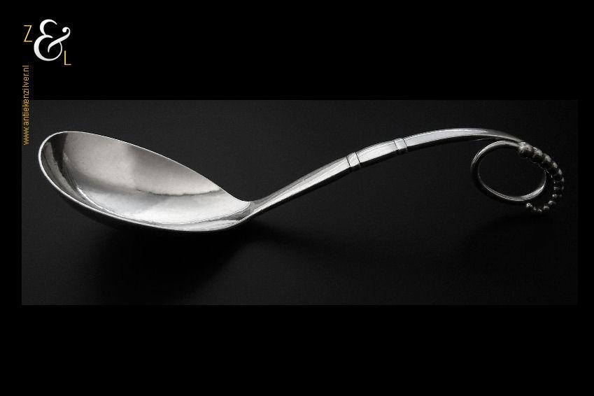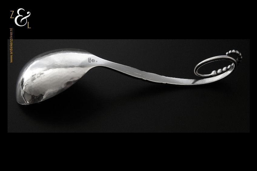 Deze grote op de hand gedreven design dienlepel uitgevoerd in model 41 is ontworpen door Georg Jensen en gemaakt in Kopenhagen Denemarken bij de wereldberoemde zilversmederij van Georg Jensen (meesterteken GEORG JENSEN in gestippeld ovaal) dat gebruikt werd van 1945 tot heden. Tevens is deze dienlepel gekeurd met STERLING DENMARK een aanduiding voor eerste gehalte zilver. De zilveren dienlepel weegt 72 gram en is 18.3 cm lang. De lepelbak is 7.5 cm lang bij 5.1 cm breed.