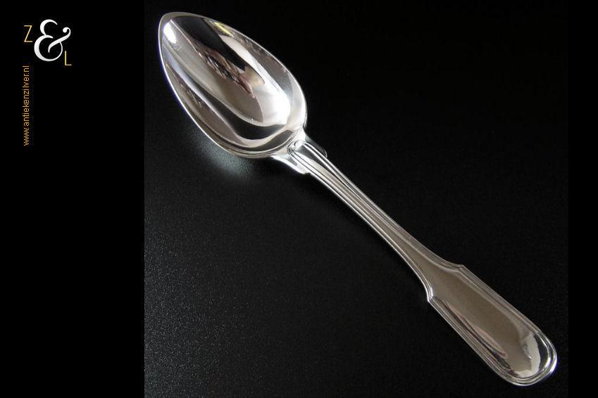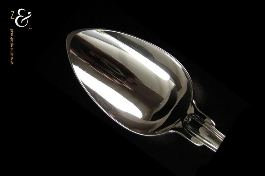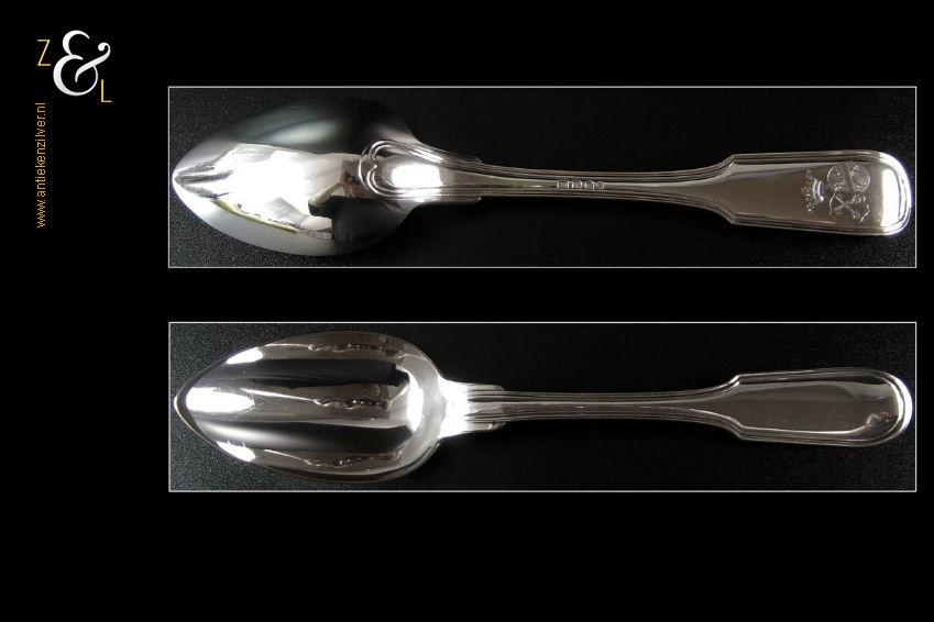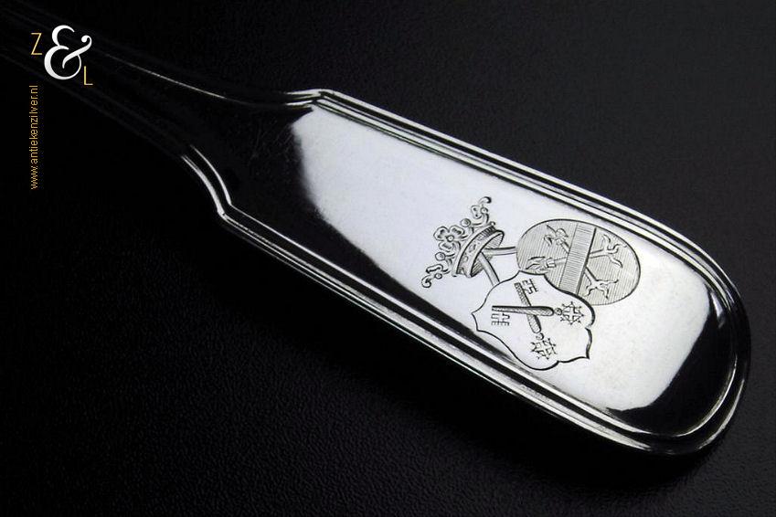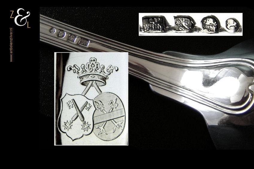 Dienlepel gemaakt in Amsterdam door wed. H. Helweg & Zn. (meesterteken WHH&Z onder anker in rechthoek) in het jaar 1876 (jaarletter R). Deze in eerste gehalte zilver uitgevoerde zware dienlepel van zéér hoge kwaliteit is uitgevoerd in spatel dubbelrondfilet. De dienlepel weegt 162 gram en is 27 cm lang. De lepelbak meet 10 cm bij 5.7 cm. Aan de achterkant van de spatel zijn twee wapens gegraveerd met daarboven een Gravenkroon.