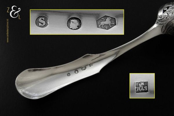 Deze eier- kievitseilepel is gemaakt in Amsterdam door H.A. Schuss (meesterteken HAS onder anker in vierkant) in het jaar 1852 (jaarletter S). De in model hartfilet uitgevoerde zilveren eier- kievitseilepel heeft aan de achterzijde van de uitgezaagde bak een prachtige diepe gravering van c-vormige voluten. De eier- kievitseilepel weegt 46 gram en is 17.7 cm lang. De bak is 6 cm lang bij 4.2 cm breed.